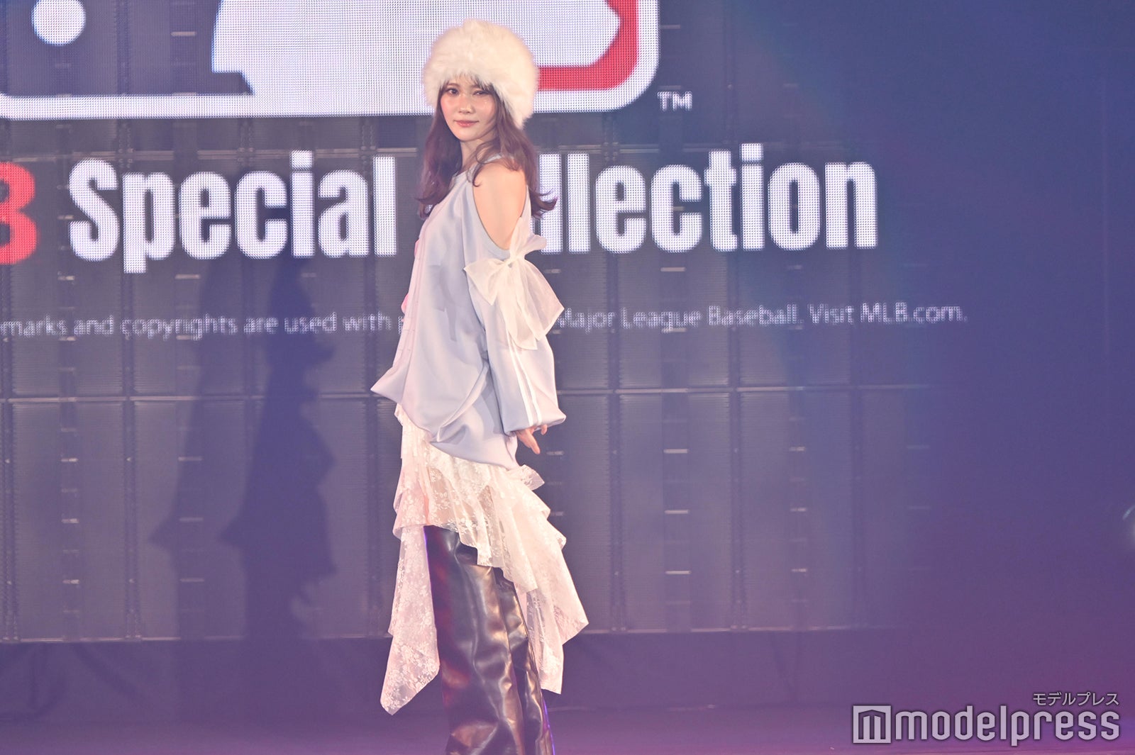 加藤は、オープンショルダーの淡いブルーのスウェットをまとって登場。白い肩をきらめかせながら、キュートにランウェイを歩いた。「ガルアワ2025 A/W」テーマは「Dress Up My Style -Play the game of You-」