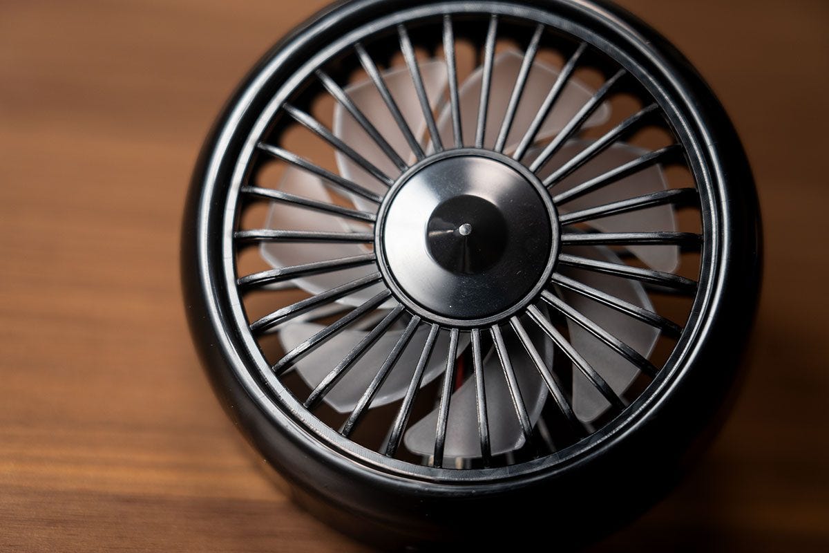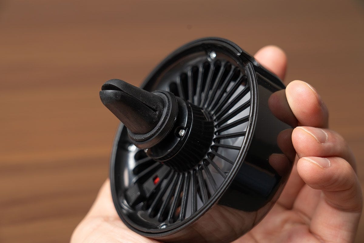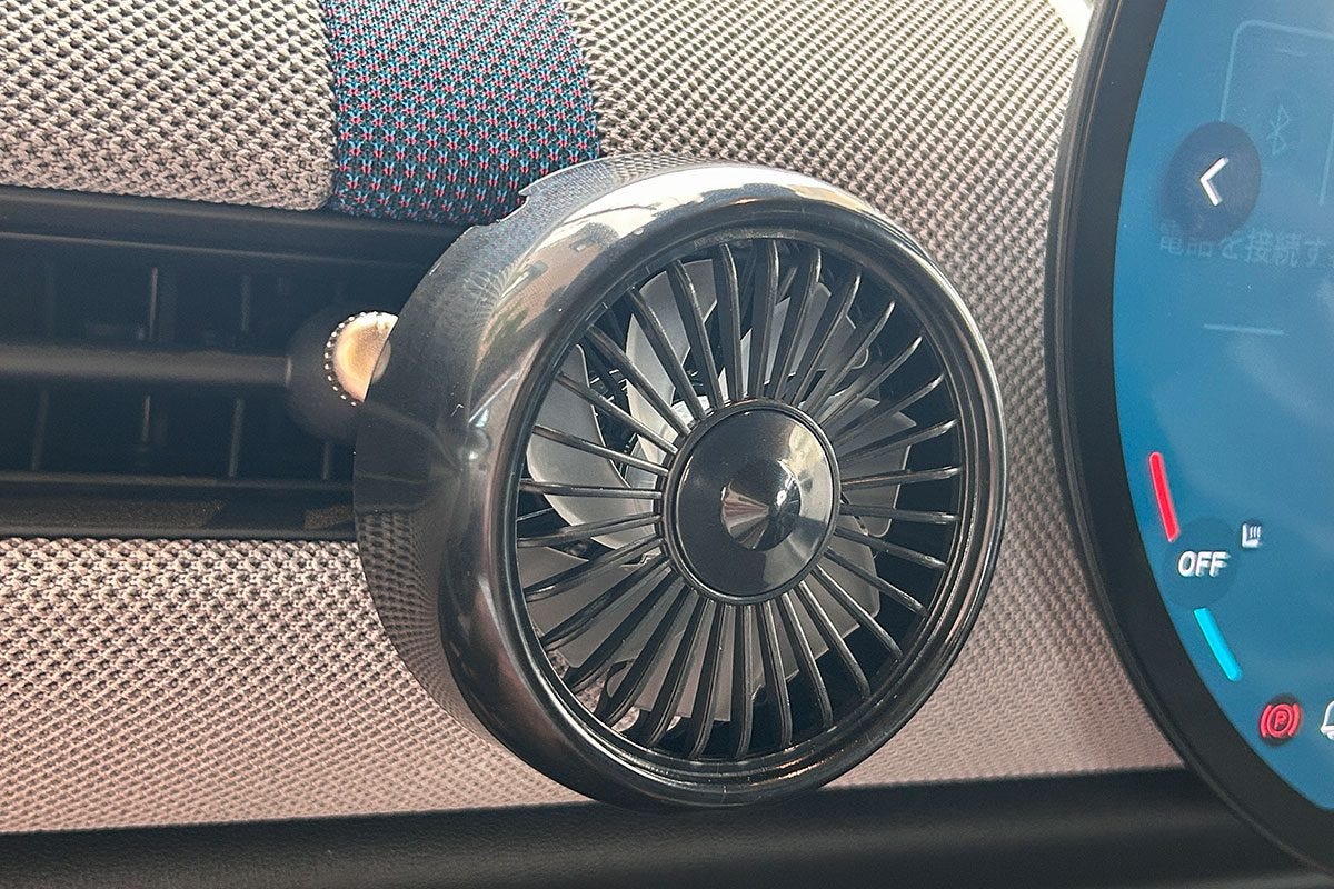 USBケーブルで給電する電池を使わないタイプの扇風機で、自動車のエアコン吹き出し口に差し込んで使用します。