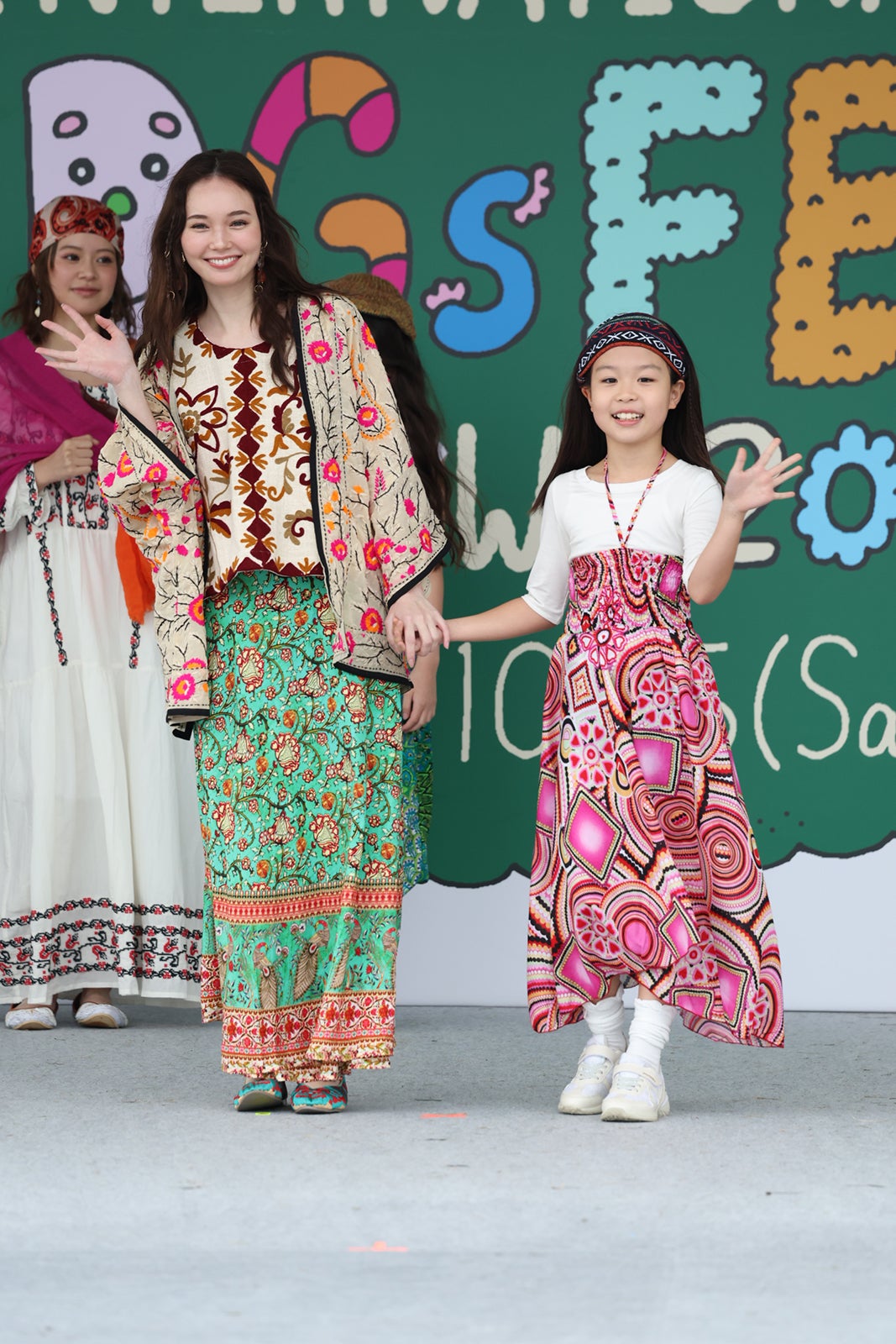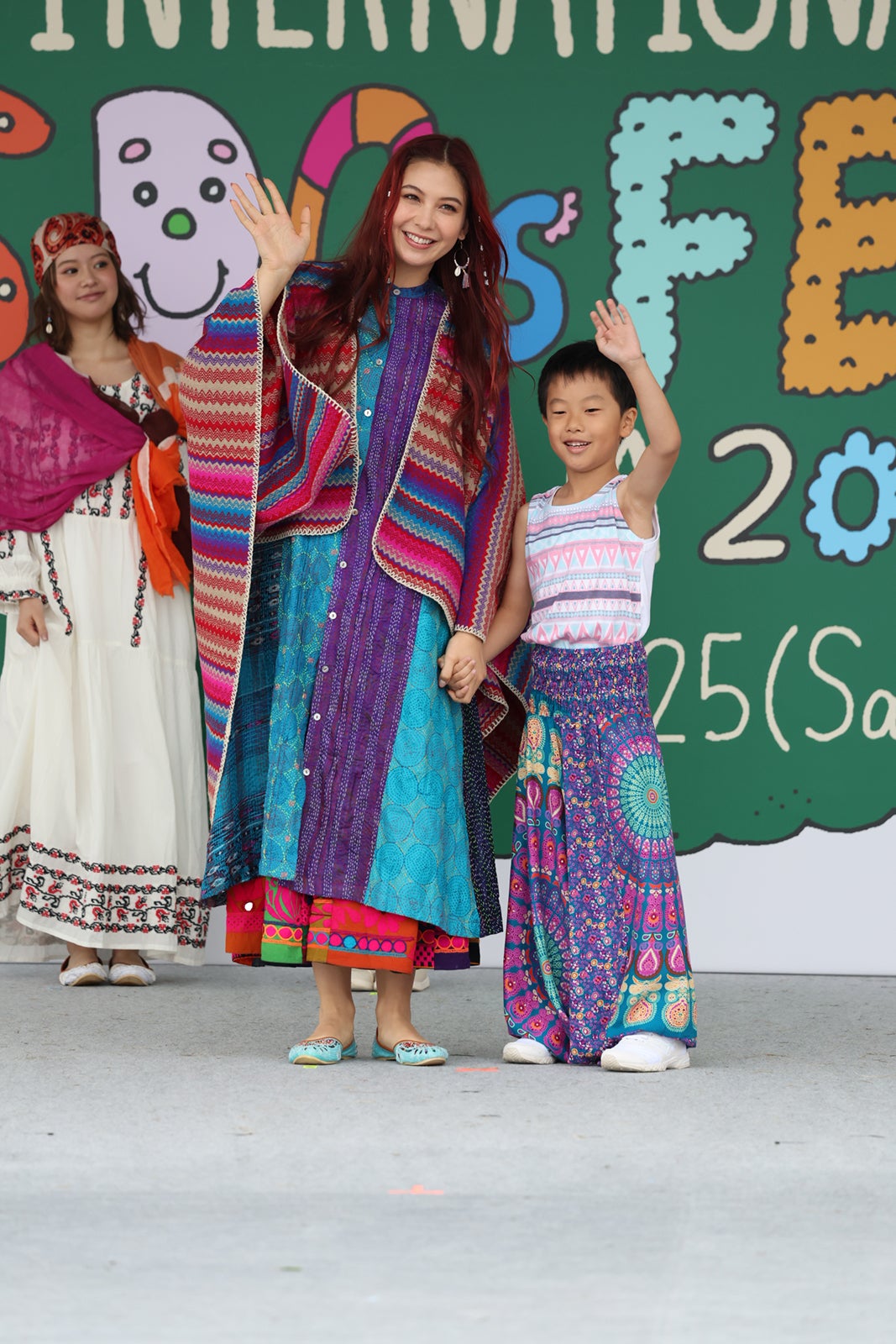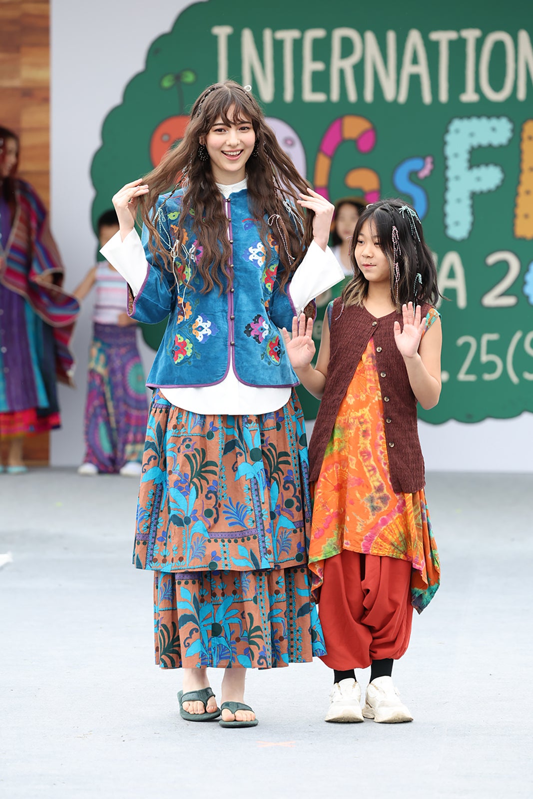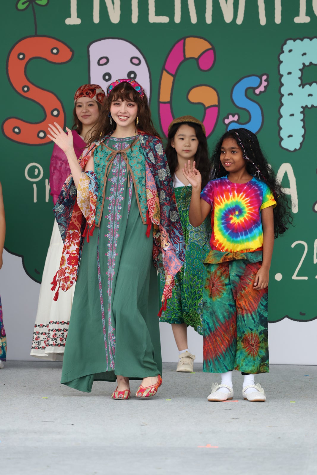 最初のオリエンタルなファッションで表現するファッションショーステージでは、多国籍なデザインの衣装に身を包んだ米澤、長谷川ミラ、加藤ナナ、土方エミリ、マーシュ彩、山下が江戸川区にある「グローバル・インディアン・インターナショナル・スクール」に通うキッズたちとランウェイ。キッズモデルと手を繋いで、笑顔で手を振りながら、トップではそれぞれのポージングを披露した。