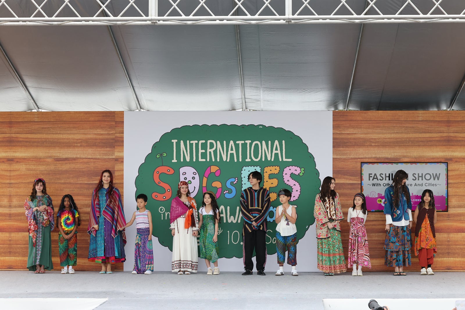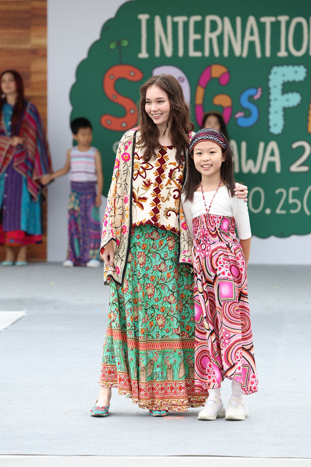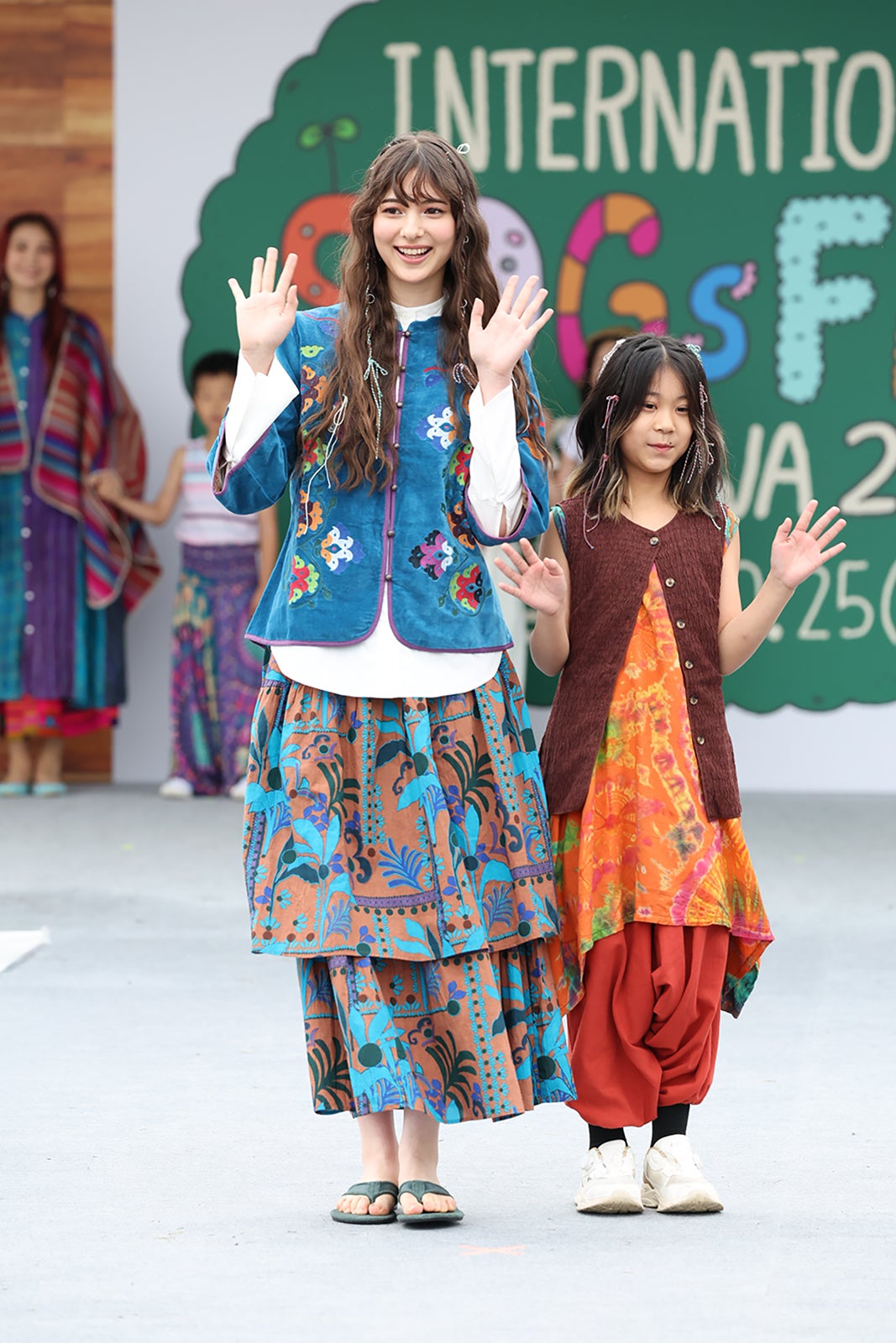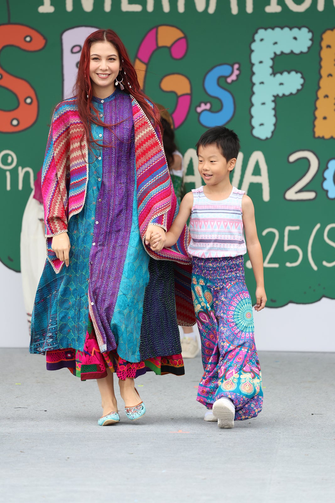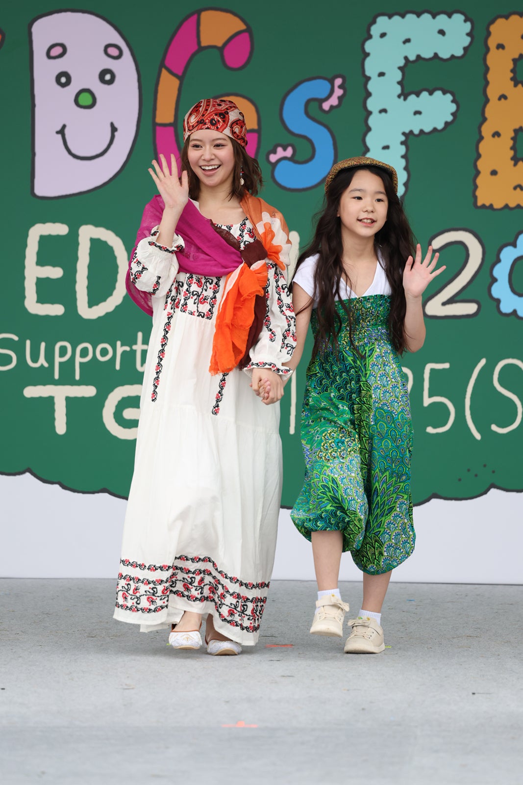 最初のオリエンタルなファッションで表現するファッションショーステージでは、多国籍なデザインの衣装に身を包んだ米澤、長谷川ミラ、加藤ナナ、土方エミリ、マーシュ彩、山下が江戸川区にある「グローバル・インディアン・インターナショナル・スクール」に通うキッズたちとランウェイ。キッズモデルと手を繋いで、笑顔で手を振りながら、トップではそれぞれのポージングを披露した。