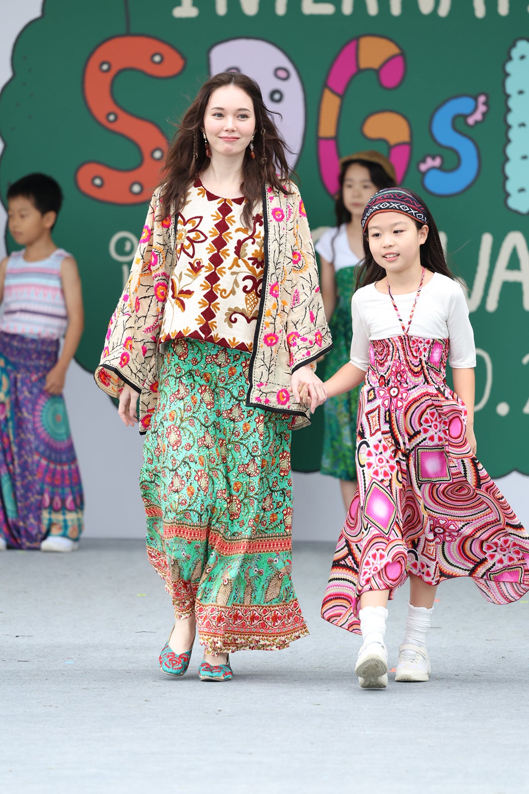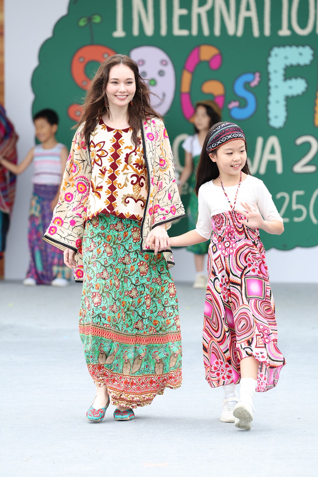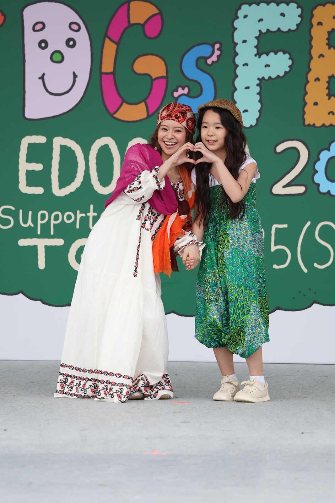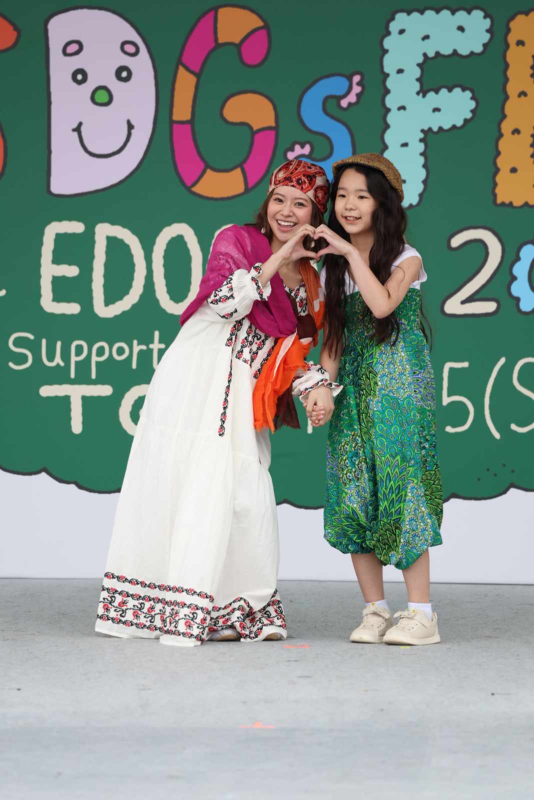 最初のオリエンタルなファッションで表現するファッションショーステージでは、多国籍なデザインの衣装に身を包んだ米澤、長谷川ミラ、加藤ナナ、土方エミリ、マーシュ彩、山下が江戸川区にある「グローバル・インディアン・インターナショナル・スクール」に通うキッズたちとランウェイ。キッズモデルと手を繋いで、笑顔で手を振りながら、トップではそれぞれのポージングを披露した。