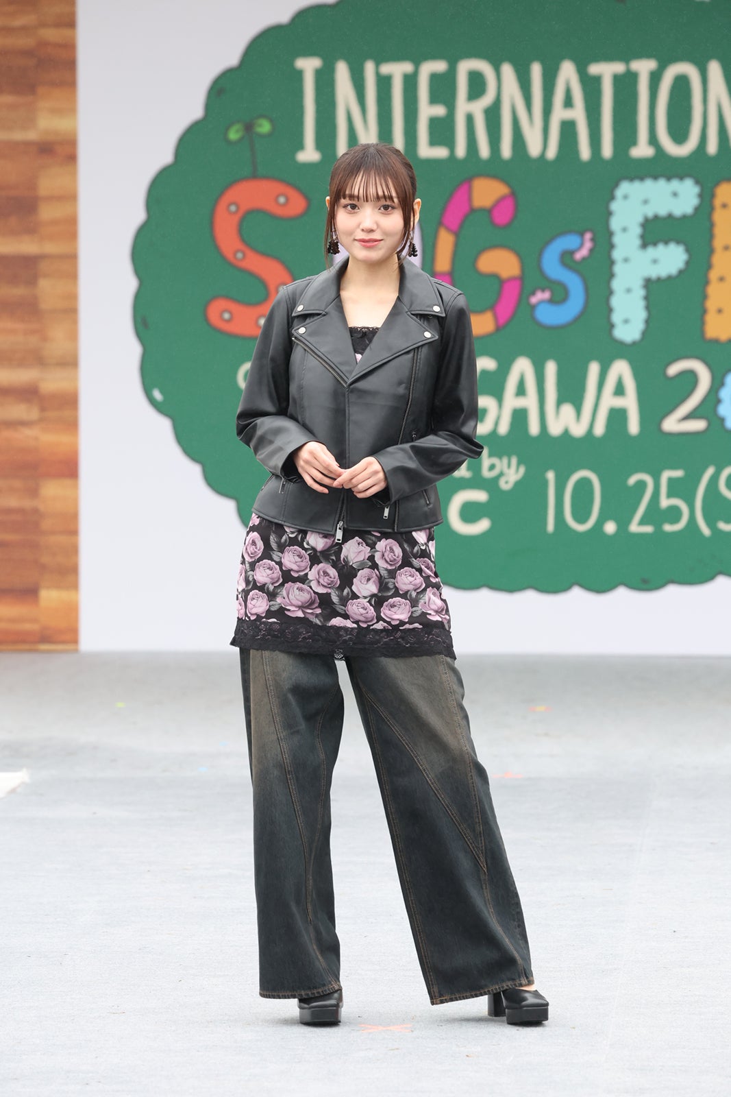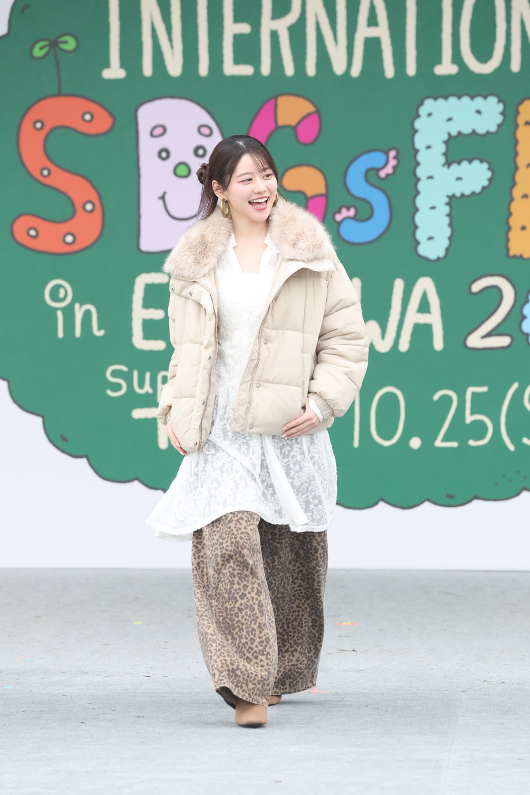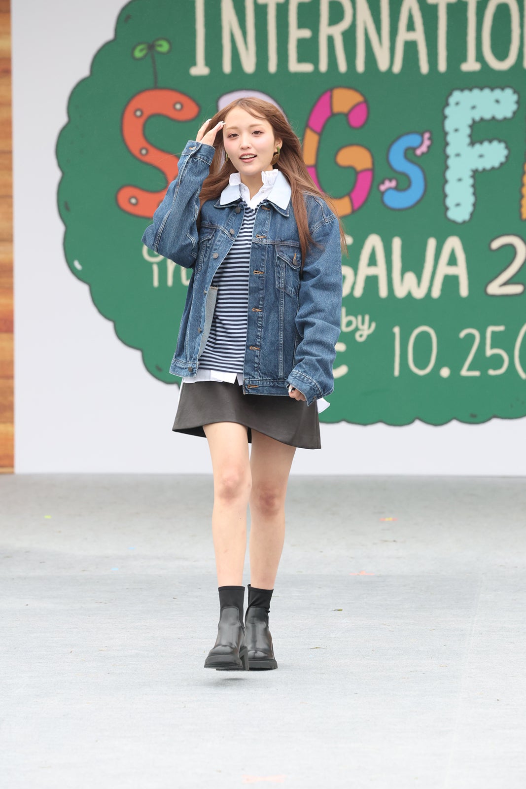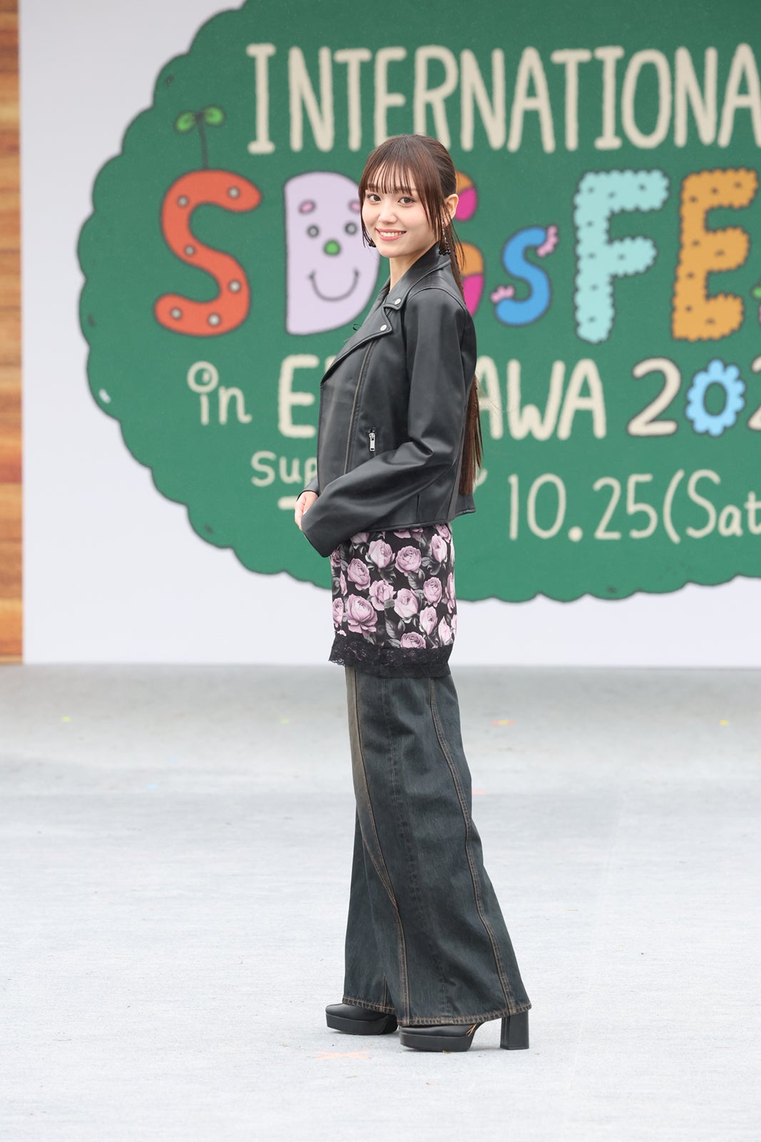 全出演者が1つ以上のサスティナブルアイテムを取り入れた地球に優しいエシカルファッションで表現したステージには、希空、りんか、鈴陽向(WILD BLUE)、ねお、野咲美優、梶原、樋口が登場。希空はエコファーがついたアウターにウォーターレスデニムのミニスカート、りんかはリサイクルアイテムのダウン、鈴はエシカルアイテムを身に着けた。ねお、野咲はアウターやスカートにエコアイテムを着用。また梶原、ねお、野咲、樋口もウォーターレスデニムを着こなした。