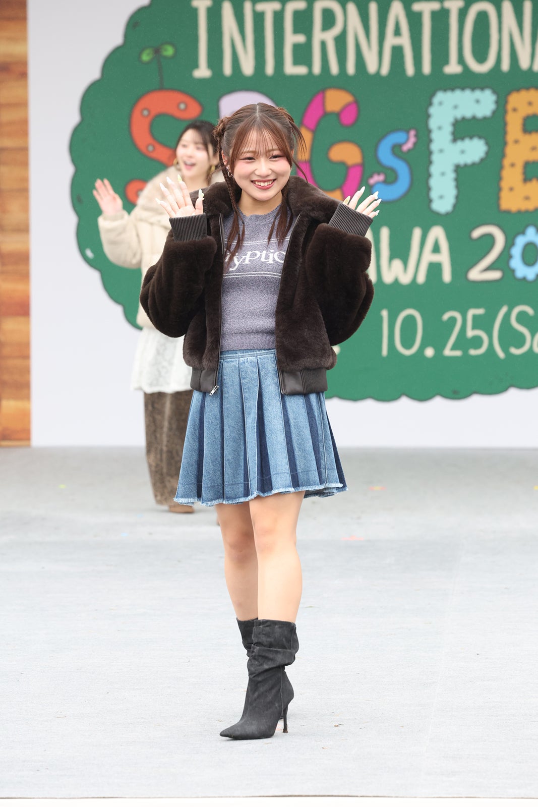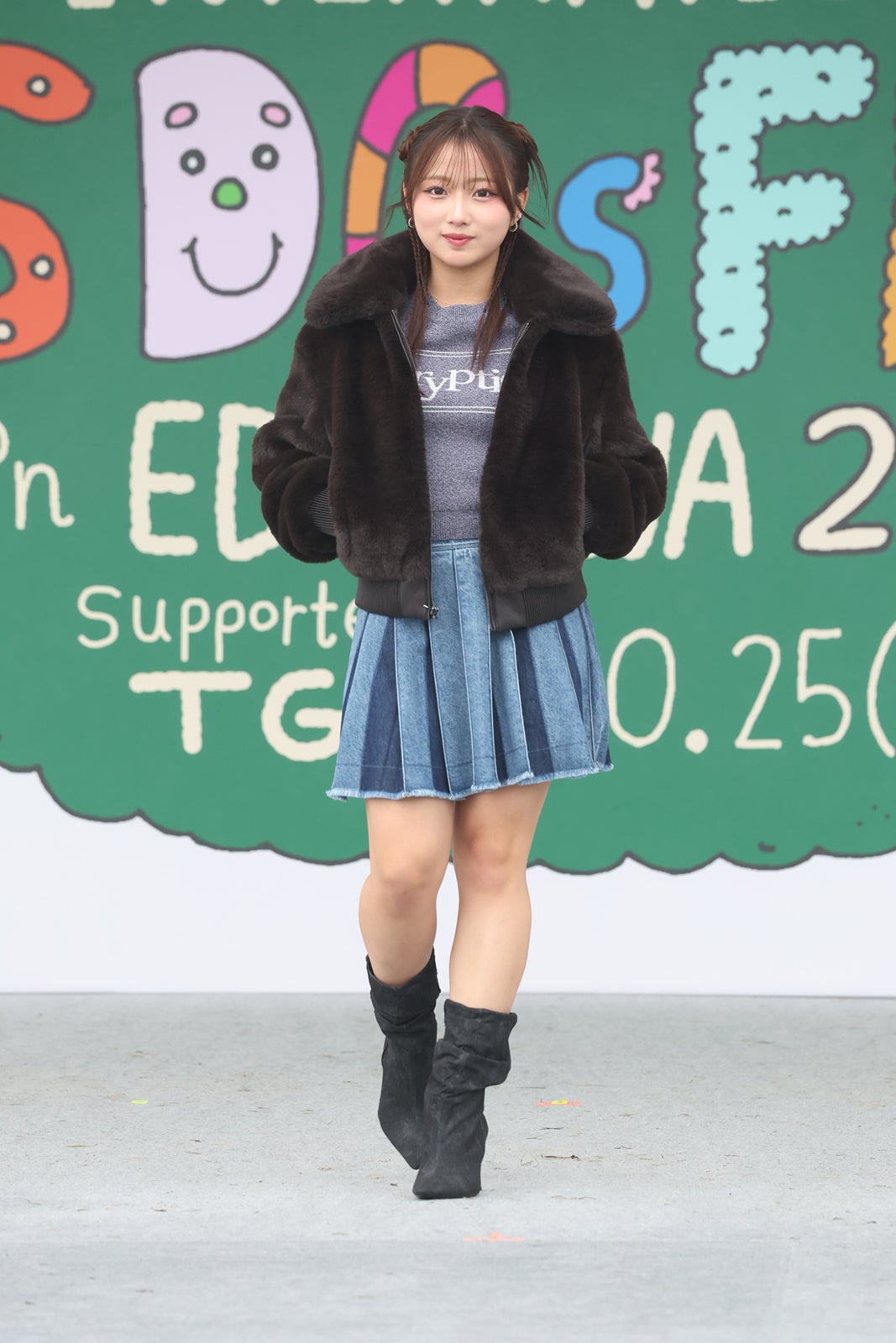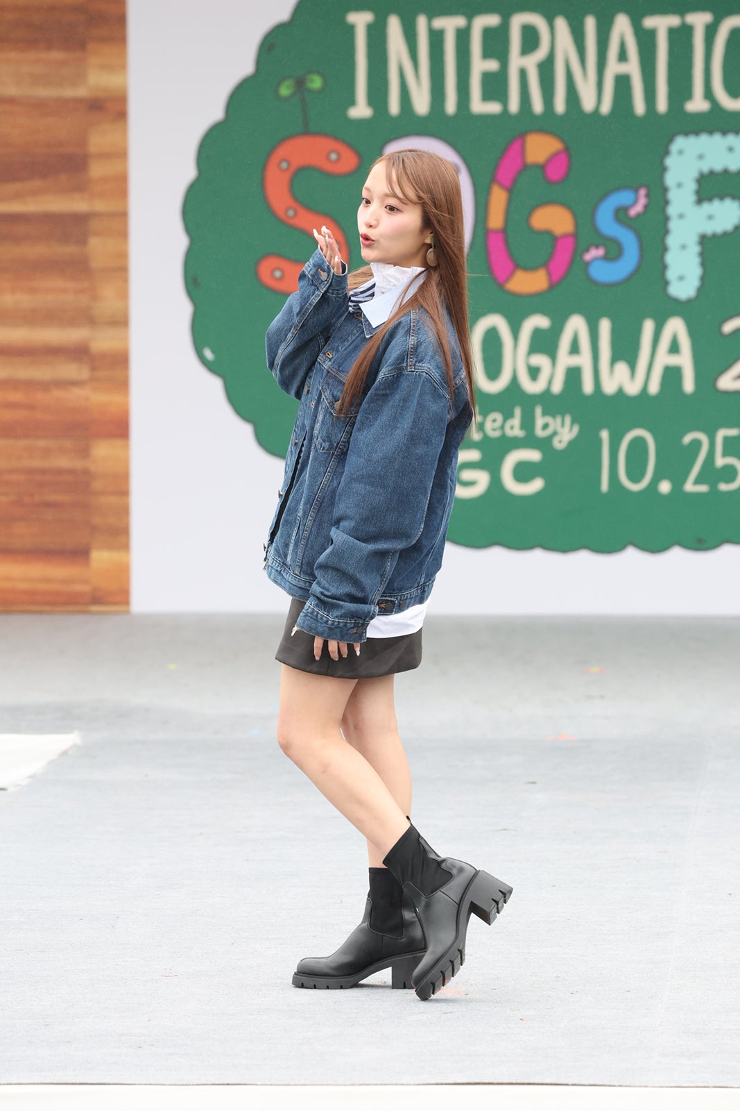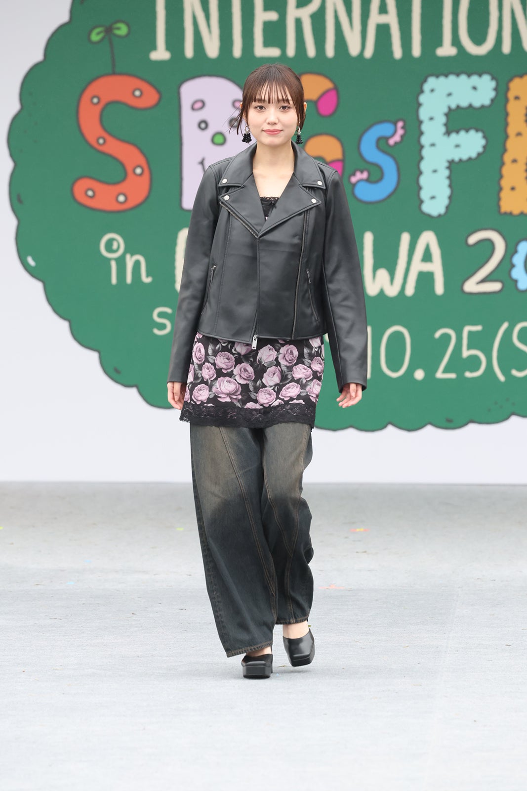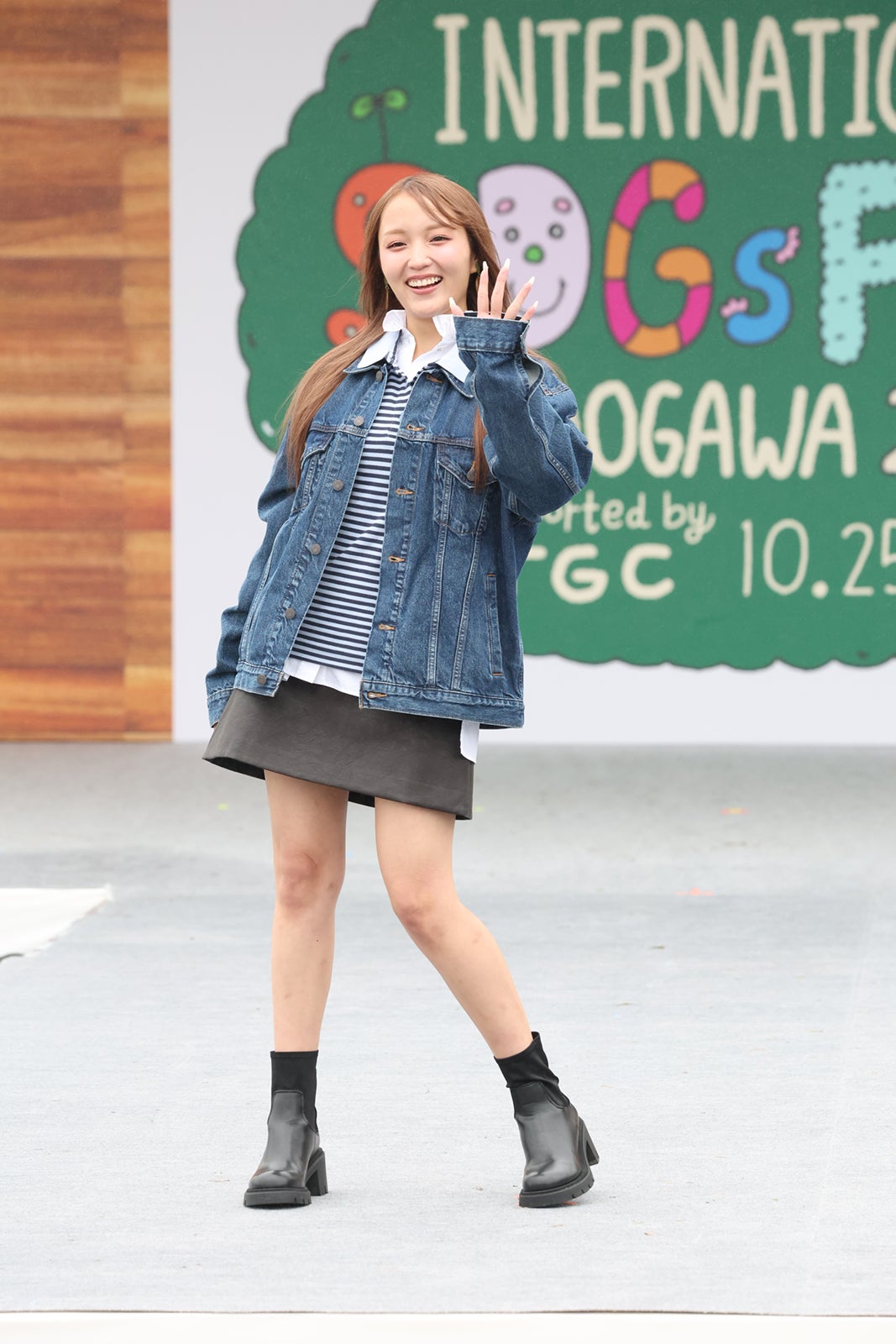 全出演者が1つ以上のサスティナブルアイテムを取り入れた地球に優しいエシカルファッションで表現したステージには、希空、りんか、鈴陽向(WILD BLUE)、ねお、野咲美優、梶原、樋口が登場。希空はエコファーがついたアウターにウォーターレスデニムのミニスカート、りんかはリサイクルアイテムのダウン、鈴はエシカルアイテムを身に着けた。ねお、野咲はアウターやスカートにエコアイテムを着用。また梶原、ねお、野咲、樋口もウォーターレスデニムを着こなした。