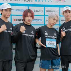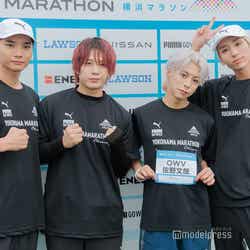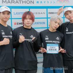 OWVは、浦野、中川、本田、佐野の順でたすきをつないでフルマラソンを完走。第1走者を務めた浦野は「熱気がすごかったですね。アナウンスだったり空砲みたいな煙とかも出ていて、お祭り感があって、すごい楽しくスタートが切れました。あとは、沿道のQWV(OWVファン)の方々がちゃんと声を出して、『OWVの浦野秀太ー!』って言ってくれて、素敵なファンの方がいっぱいいるなというのはありました」と振り返った。第2走者の中川は「やっぱり仲間がいるというのは相当大きくなると思うので、もし1人で参加しようと考えている方がいらっしゃたら、お友達とかと一緒に応募するのがすごいおすすめなのかなというのは、このリレーの形式を経て感じました」とメンバーの力を実感していた。