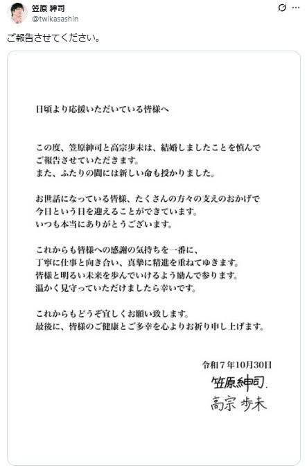 笠原はX(旧Twitter)にて、高宗はInstagramにて連名の書面を同時に投稿。「結婚しましたことを慎んでご報告させていただきます。また、ふたりの間には新しい命も授かりました」と報告した。また高宗は「私のお腹の中には今小さな命が宿っております。沢山のご縁や奇跡が重なり、今に繋がっております。結婚も母になる事も半ば諦めていた私が、まさかこの様なご報告を皆様にする日がくるなんてと、自分でも驚いております」と心境を伝えた。さらに「妊娠がわかってからは現場のキャスト・スタッフさん方が私の身体の事を気遣って頂き、サポートして下さいました」と感謝。「しばらくは大好きな舞台のお仕事はお休みとなります。出演を予定しておりました、私が所属する劇団6番シードの次回公演『ザ・ボイスアクター』も誠に勝手ながら産休とさせて頂きます事をどうかお許しください」と伝え「元気な子を産んでさらにパワフルになった女優・高宗歩未で必ず復帰します!」と宣言した。