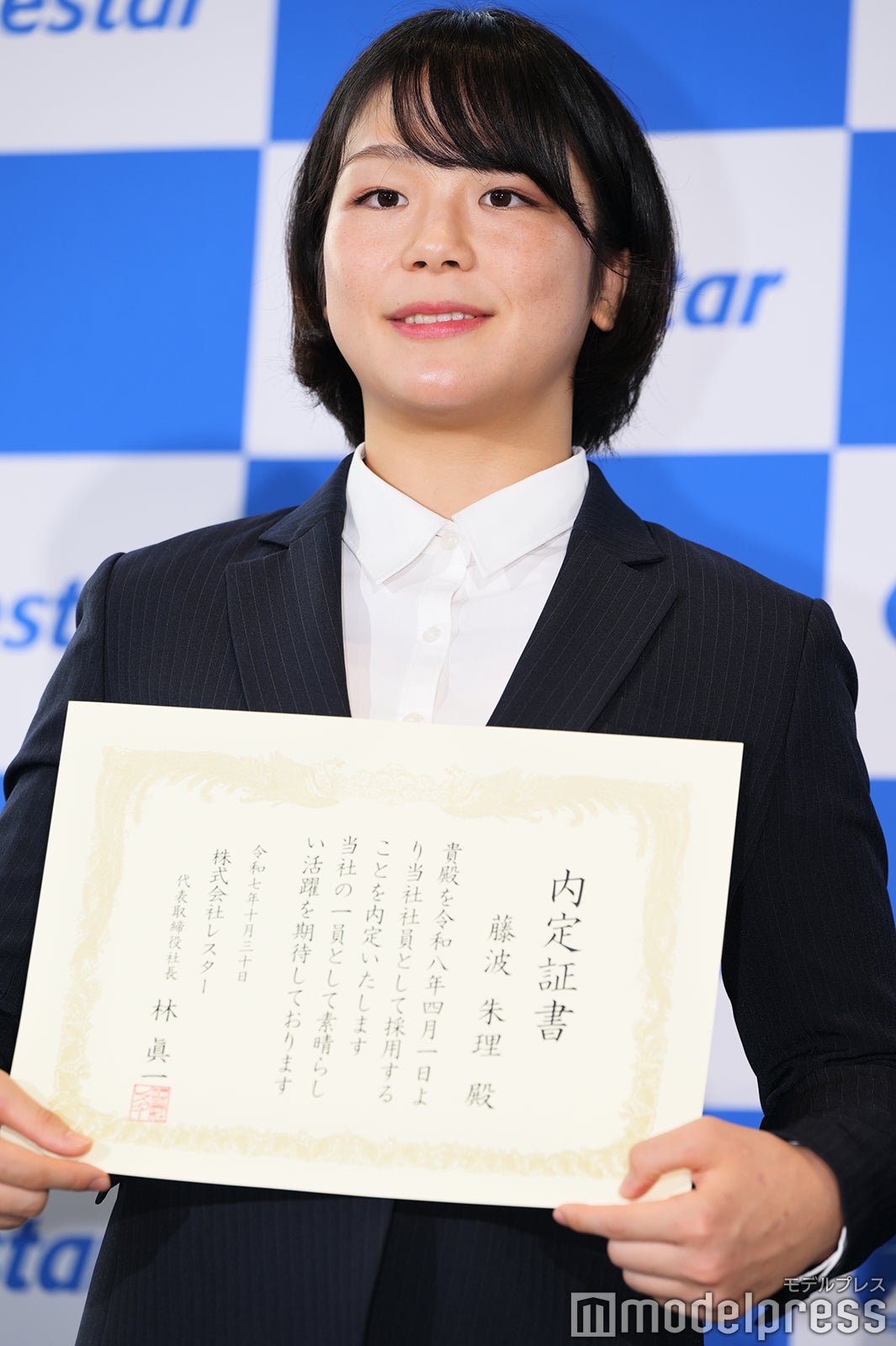 レスリングで選手の藤波朱理が30日、都内で開催された入社内定記者発表会に出席。試合より緊張したことを明かす場面があった。