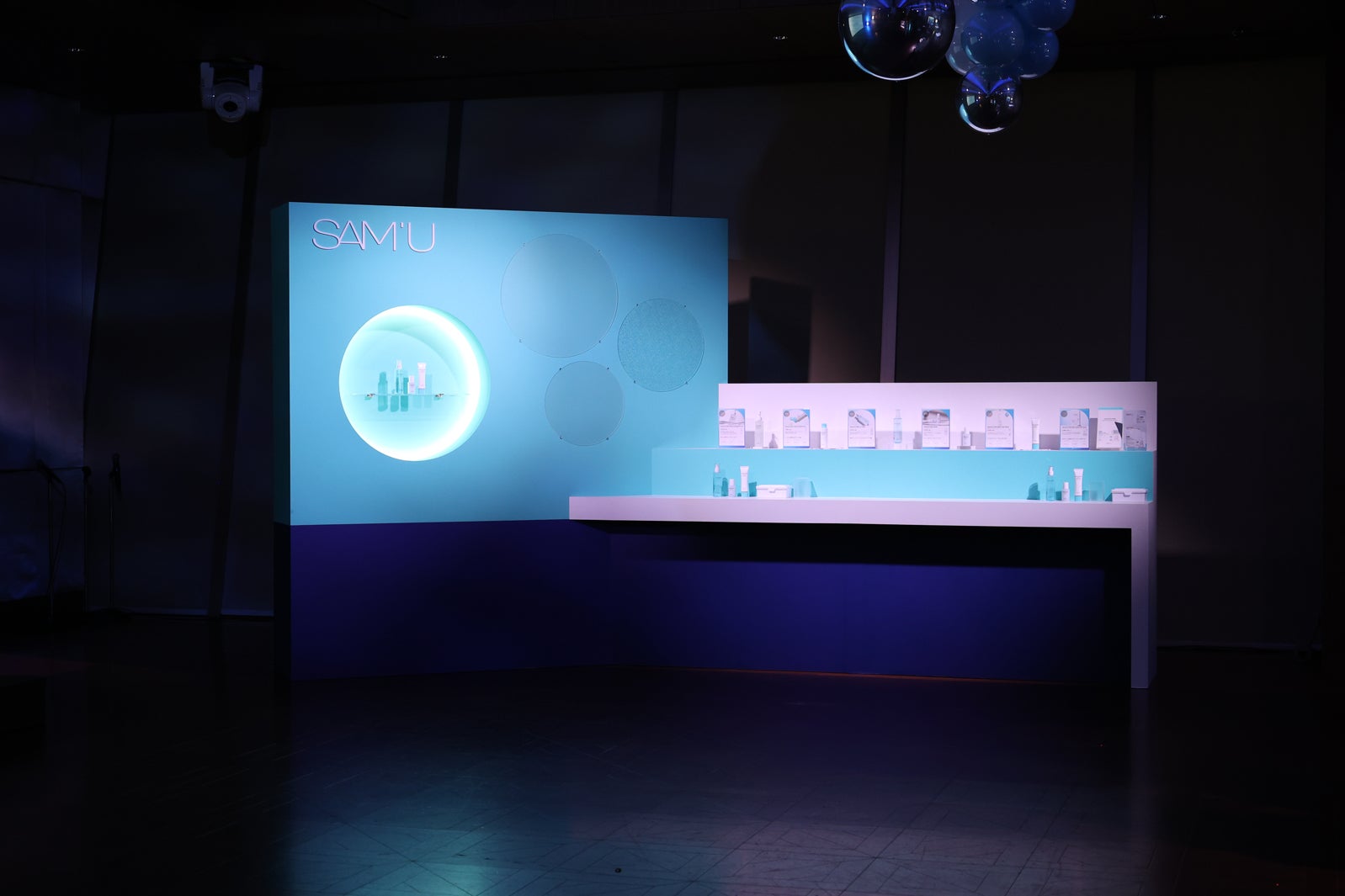 ― 今回のイベント・パーティーのタイトルが“Deep Sea with SAM’U”となっております。 まるで深海の中にあるようなこの空間いかがでしょうか?先に空間を体験されたとのことですが気になるスポットや感想を伺えますか?すごく癒される空間になっていて素敵だなと思いました。「泡の(特徴的な)化粧水」がこの空間にデザインされていて、この化粧水の中にいるような、そんな気持ちになりました。