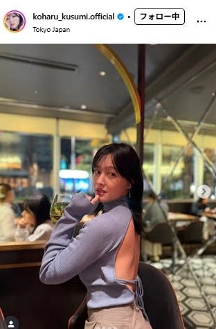 久住は、落ち着いた雰囲気の店内でワイングラスを手にした写真を投稿。ブルーグレーの長袖トップスは背中が大きく開いたデザインで、細いリボンが結ばれているのが特徴。柔らかな素材が肌に寄り添い、美しい背中のラインを引き立てている。久住小春の投稿に反響