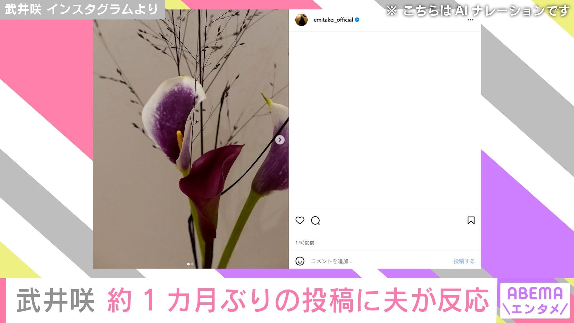 武井咲(31)、約1カ月ぶりにインスタ更新!夫・EXILE TAKAHIRO(40)が反応 ファンからは「部屋にお花があるって癒やされて幸せですよね」と反響