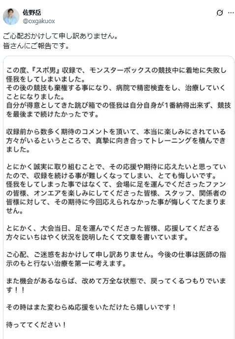 佐野は「この度、『スポ男』収録で、モンスターボックスの競技中に着地に失敗し怪我をしてしまいました。その後の競技も棄権する事になり、病院で精密検査をし、治療していくことになりました」と報告。「自分が得意としてきた跳び箱での怪我は自分自身が1番納得出来ず、競技を最後まで続けたかったです」と後悔をつづった。今後の仕事については「医師の指示のもと行ない治療を第一に考えます」と伝えた佐野。最後には「また機会があるならば、改めて万全な状態で、戻ってくるつもりでいます!!」と意気込み、「その時はまた変わらぬ応援をいただけたら嬉しいです!待っててください!」と呼びかけた。