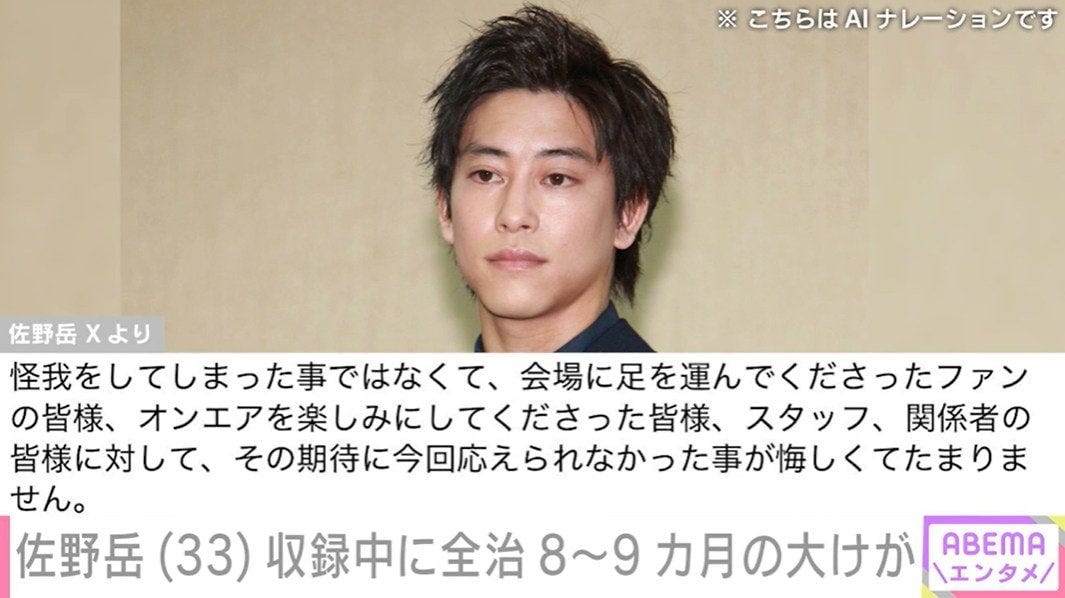 佐野岳(33)、番組収録中に全治8~9カ月の大けが「長いことリハビリかな…?」「この企画は見直したほうがいい」などの声