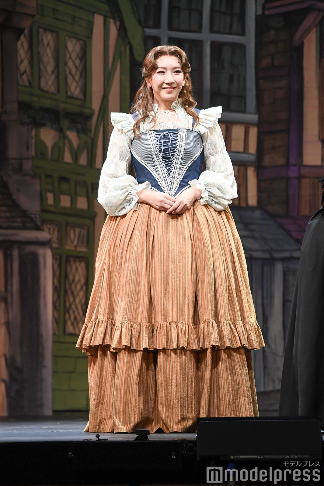 同作で清教徒の娘・ポーシャを演じる矢吹。今回の開幕直前取材では、普段の茶髪姿からは雰囲気をガラリと変えた金髪のウィッグ姿に、舞台となるルネサンス時代のロココファッションを感じさせる役衣装の黒のドレスを着用して登場した。冒頭のコメントで矢吹は、「福田さんの作品は初めてで、稽古が本当に皆さんが自由にやられてるのを見て本当に楽しかったです」と稽古期間を回顧。「ちょっと笑える作品だと思うので、年末は笑い締めしていただけたらと思いますし、2026年もあるので年始は笑い始めにしていただけたらと思います!」と呼びかけていた。