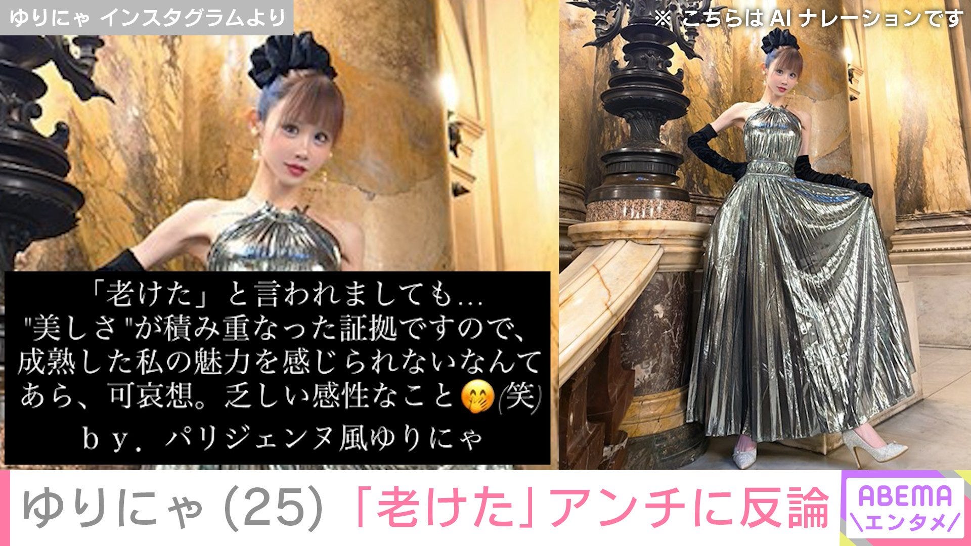 「『老けた』と言われましても…“美しさ”が積み重なった証拠ですので、成熟した私の魅力を感じられないなんて、あら、可哀想、乏しい感性なこと。by.パリジェンヌ風ゆりにゃ」と、最新ショットとともに反論している。