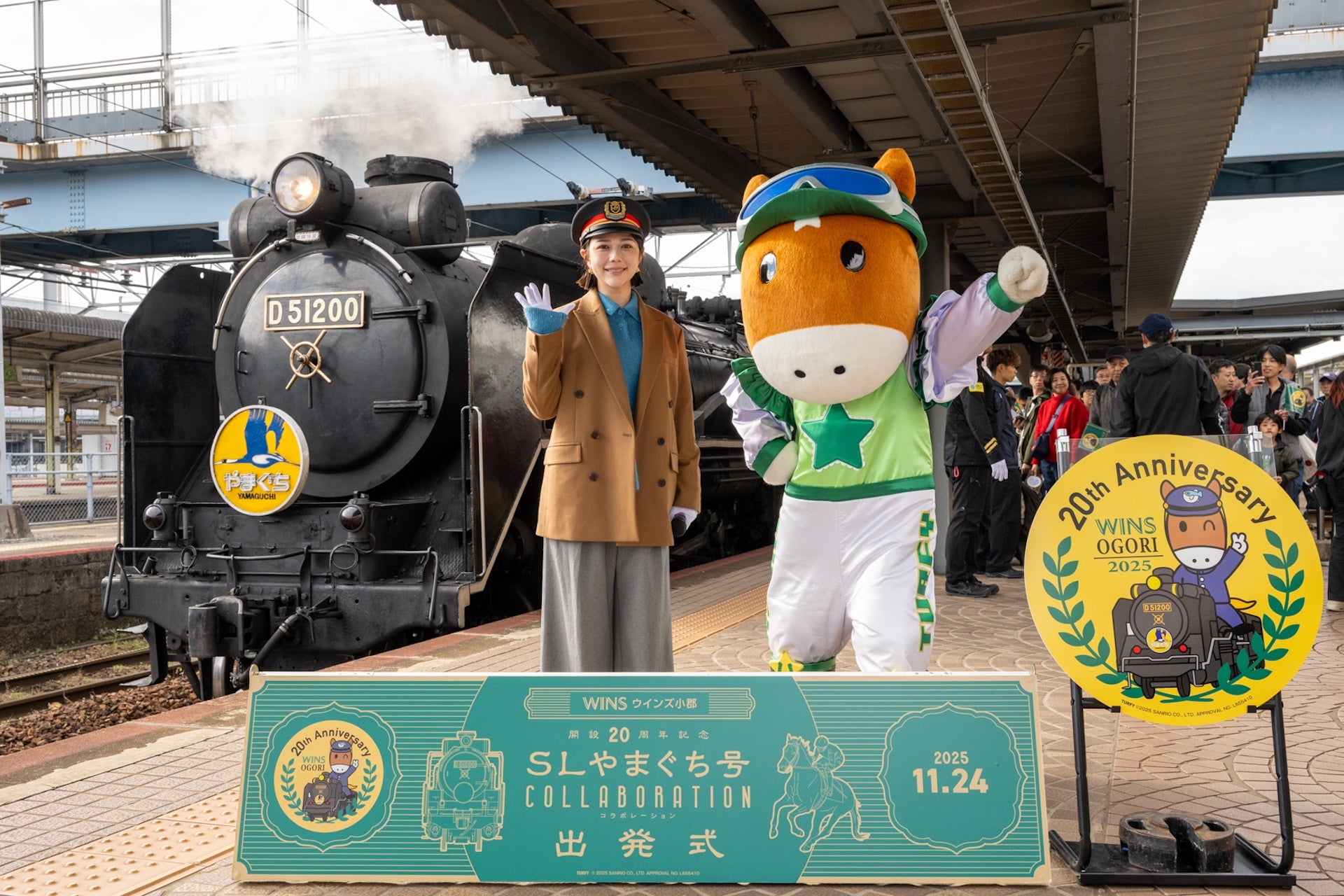 山口県出身で山口ふるさと大使を務めるタレントの村重杏奈が11月24日、JR新山口駅(山口市)で行われた『ウインズ小郡開設20周年記念 SLやまぐち号コラボレーションイベント ヘッドマーク披露、並びに出発式典』に出演し、地元での大役を務めた。