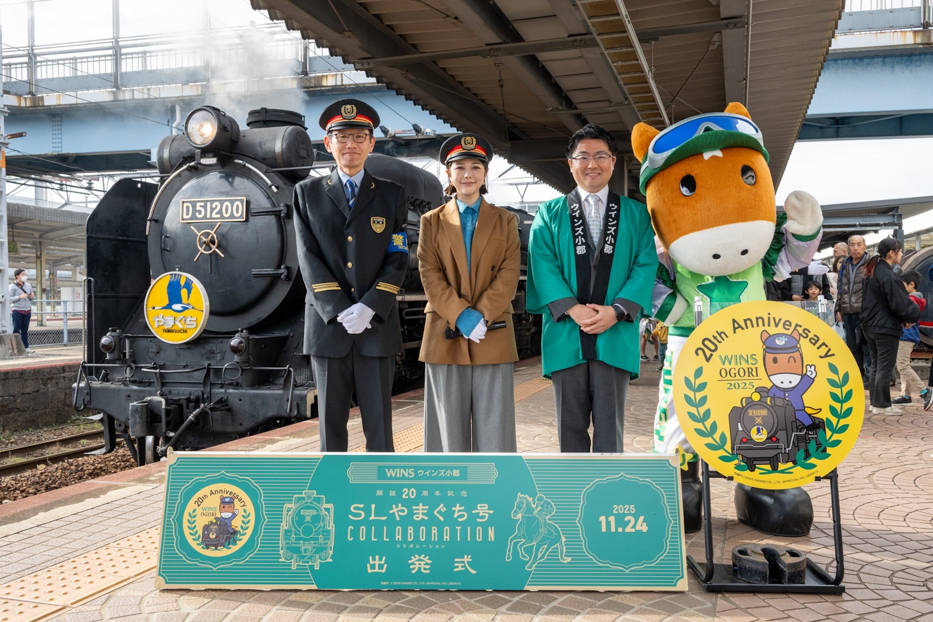 イベントは、2025年で20周年を迎えた「JRAウインズ小郡」(JR新山口駅から車で約10分)と、新山口駅-津和野駅間を走る「SLやまぐち号」がコラボして開催したもの。JRAマスコットキャラクター「ウインズ小郡ご当地ターフィー」のモチーフの一つがSLであることがきっかけとなり、今回の企画が実現した。式典ではまず、JRAウインズ小郡の待鳥純人所長から、ウインズ小郡の歴史と、「地域とともに歩む」という理念を共にするJR西日本とJRAウインズ小郡との初めての共同イベントであることが説明された。待鳥所長は「ひとつの団体や企業ではできないことも、志を同じくする者同士が連携することで、新しい価値が生まれる。本日お披露目するオリジナルヘッドマークには、そうした願いも込められています」とあいさつした。