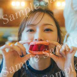・セブンネットショッピング:チンクエテッレにあるビーチの岩場にて海⾵を感じる梅ちゃん・HMV&BOOKS SHIBUYA:ホテルのベッドにて苺をパクリ。⿊ランジェリーで⼤⼈な1枚