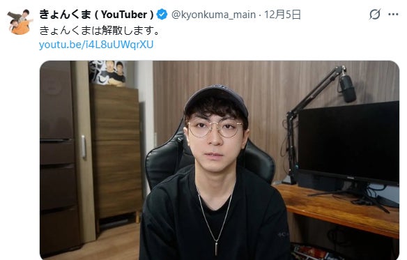 12月5日に解散を発表したYouTuber・きょんくまが同月17日、自身のチャンネルを更新。火事の被害にあったことを明かした。
