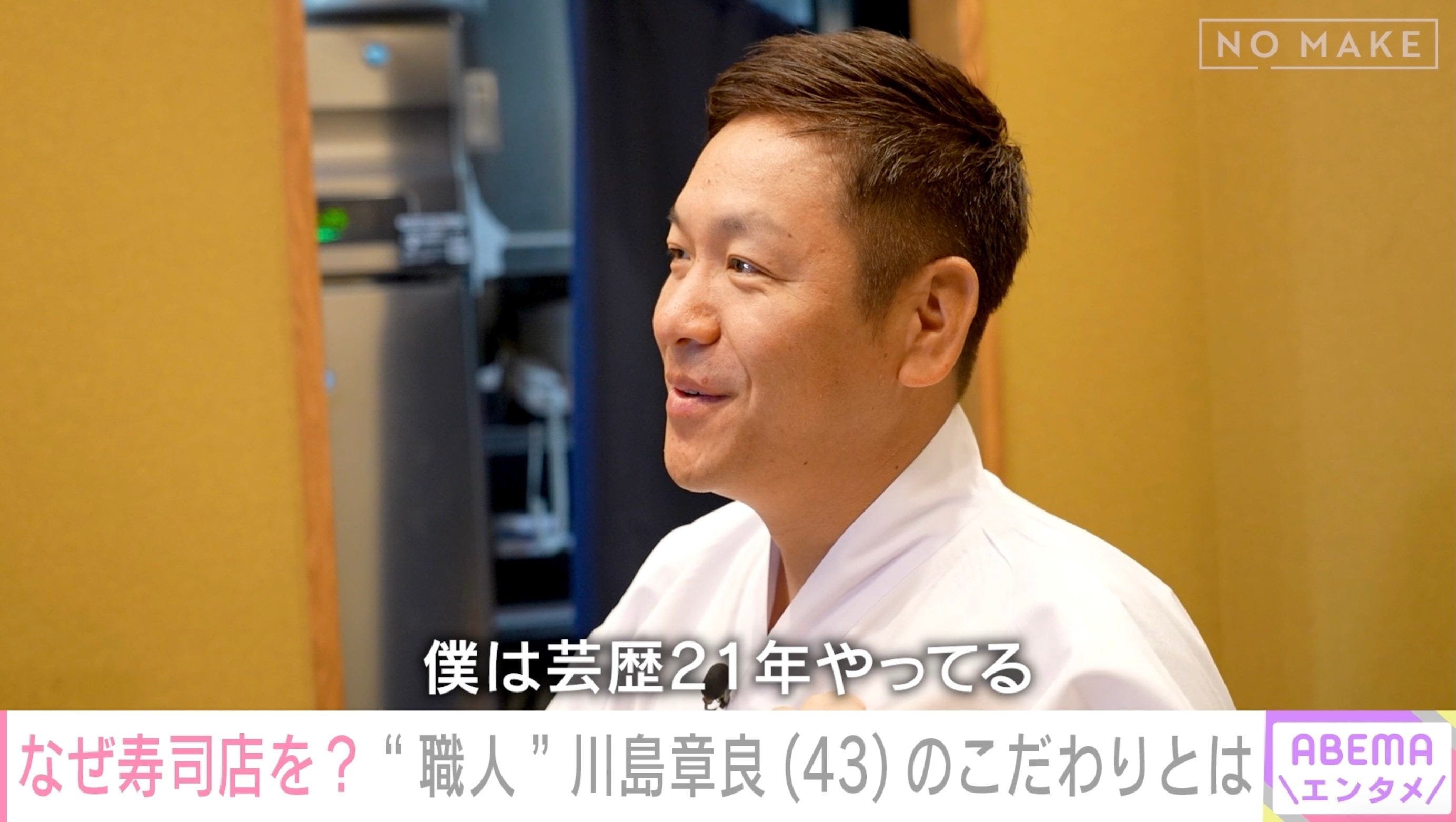 お笑いコンビ「はんにゃ.」の川島章良は今年から紹介制の寿司屋で、客前で寿司を握っている。そんな川島の“転身”の理由と1日に『ABEMA エンタメ』の密着企画「NO MAKE」が迫った。