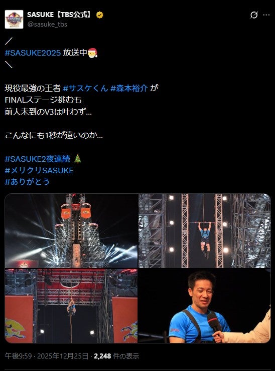 25日よる6時より放送のTBS系『SASUKE2025 ~第43回大会~』にて、“完全制覇のサスケくん”の愛称で知られる森本裕介が、ファイナルステージへ進出。残り約1秒のところでボタンに手が届かず、完全制覇を逃した。