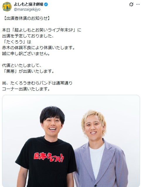 公式サイトでは、「本日『超よしもとお笑いライブ年末SP』に出演を予定しておりました、『たくろう』は赤木の体調不良により休演いたします。誠に申し訳ございません」と謝罪。「代演といたしまして、『黒帯』が出演いたします」と伝え、尚、たくろうきむらバンドは通常通りコーナー出演いたします」と結んでいる。たくろう「M-1グランプリ2025」王者に