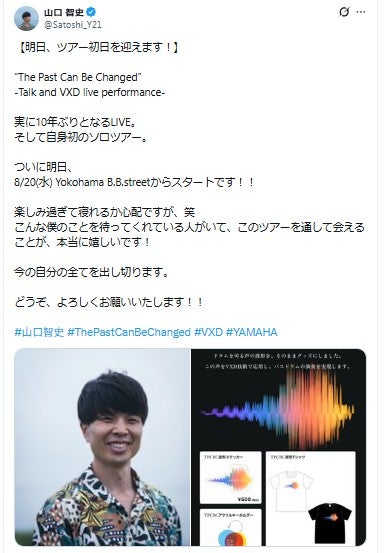 山口は、持病であるフォーカル・ジストニアが悪化したため2015年9月から無期限休養を発表。2025年8月からは、自身初のソロツアー「The Past Can Be Changed - Talk and VXD live performance-」を開催し、10年ぶりにファンの前に立った。(modelpress編集部)