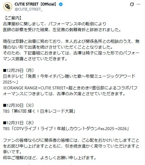 投稿では「古澤里紗に関しまして、パフォーマンス中の転倒により医師の診察を受けた結果、左足首の剥離骨折と診断されました」と報告。「現在は安静と治療に努めており、本人および関係各所との相談のうえ、無理のない形で出演を続けさせていただくこととなりました」と今後の活動について伝えた。12月29日放送の日本テレビ「発表!今年イチバン聴いた歌~年間ミュージックアワード2025~」、12月30日放送のTBS「第67回 輝く!日本レコード大賞」、12月31日放送のTBS「CDTVライブ!ライブ!年越しカウントダウンFes.2025→2026」に関しては「古澤は椅子に座った形でのパフォーマンス披露とさせていただきます」と説明。「発表!今年イチバン聴いた歌~年間ミュージックアワード2025~」でのORANGE RANGE×CUTIE STREET×超ときめき♡宣伝部によるコラボパフォーマンスについては、「古澤のみ欠席とさせていただきます」としている。