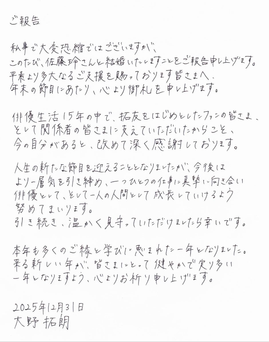 大野は「私事で大変恐縮ではございますが、このたび、佐藤玲さんと結婚いたしますことをご報告申し上げます」と報告。「俳優生活15年の中で、拓友をはじめとしたファンの皆さま、そして関係者の皆さまに支えていただいたからこそ、今の自分があると、改めて深く感謝しております。人生の新たな節目を迎えることとなりましたが、今後はより一層気を引き締め、一つひとつの仕事に真摯に向き合い、俳優として、そして一人の人間として成長していけるよう努めてまいります引き続き、温かく見守っていただけましたら幸いです」と決意を新たにした。また、佐藤も「私事で大変恐縮ではございますが、この度、大野拓朗さん と結婚いたしますことをご報告申し上げます」と発表し、「俳優としての活動に加え、近年はプロデュースの領域に携わる中で、皆さまからいただく温かいご声援とご指導に深く感謝しております。新たな生活を迎えることとなりましたが、より一層気を引き締め、作品づくりと表現の探求に誠実に向き合ってまいります」と意気込み。「来る新年が、皆さまにとってすこやかで、実り多い一年となりますよう、心よりお祈り申し上げます」と結んでいる。
