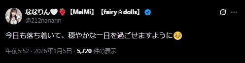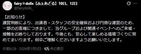 5日、ななりんが所属するアイドルグループ・fairy☆dollsの公式Xは「運営判断により、出演者・スタッフの安全確保および円滑な運営のため、一部のお客様につきまして、当グループおよび関連イベントへのご来場・接触をお断りしております。今後とも、安心して楽しめる環境づくりに努めてまいります。何卒ご理解くださいますようお願いいたします」と発表している。