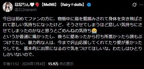 アイドルグループ「MelMi」「fairy☆dolls」「fairy☆elements」に所属するななりんが4日、自身のX(旧Twitter)を更新。物販中、ファンに肩を掴まれ体を突き飛ばされるトラブルに遭ったと報告した。