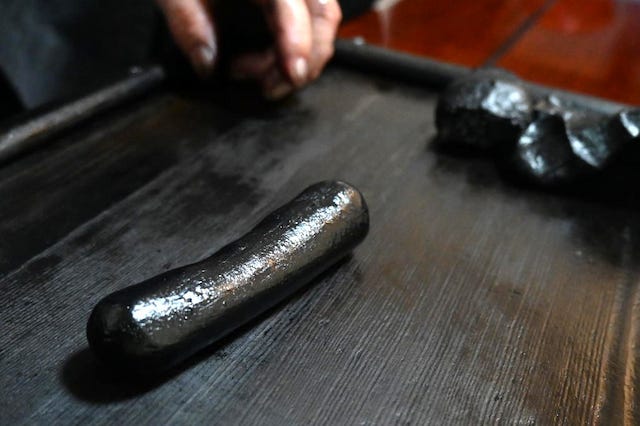 握りやすいよう棒状に 炊飯器で温めた生墨を取り出し、空気を抜く工程までは職人が担当。