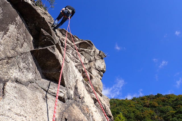 Zero gravityの「ゼロ-ロック滋賀 比良山系 獅子岩 初心者向≪Ver-1≫」 高低差約40mの岩壁を、ロープに沿って登っていきます。コースは参加者のレベルに応じて設定されており、初めてでも無理なく挑戦できる構成です。