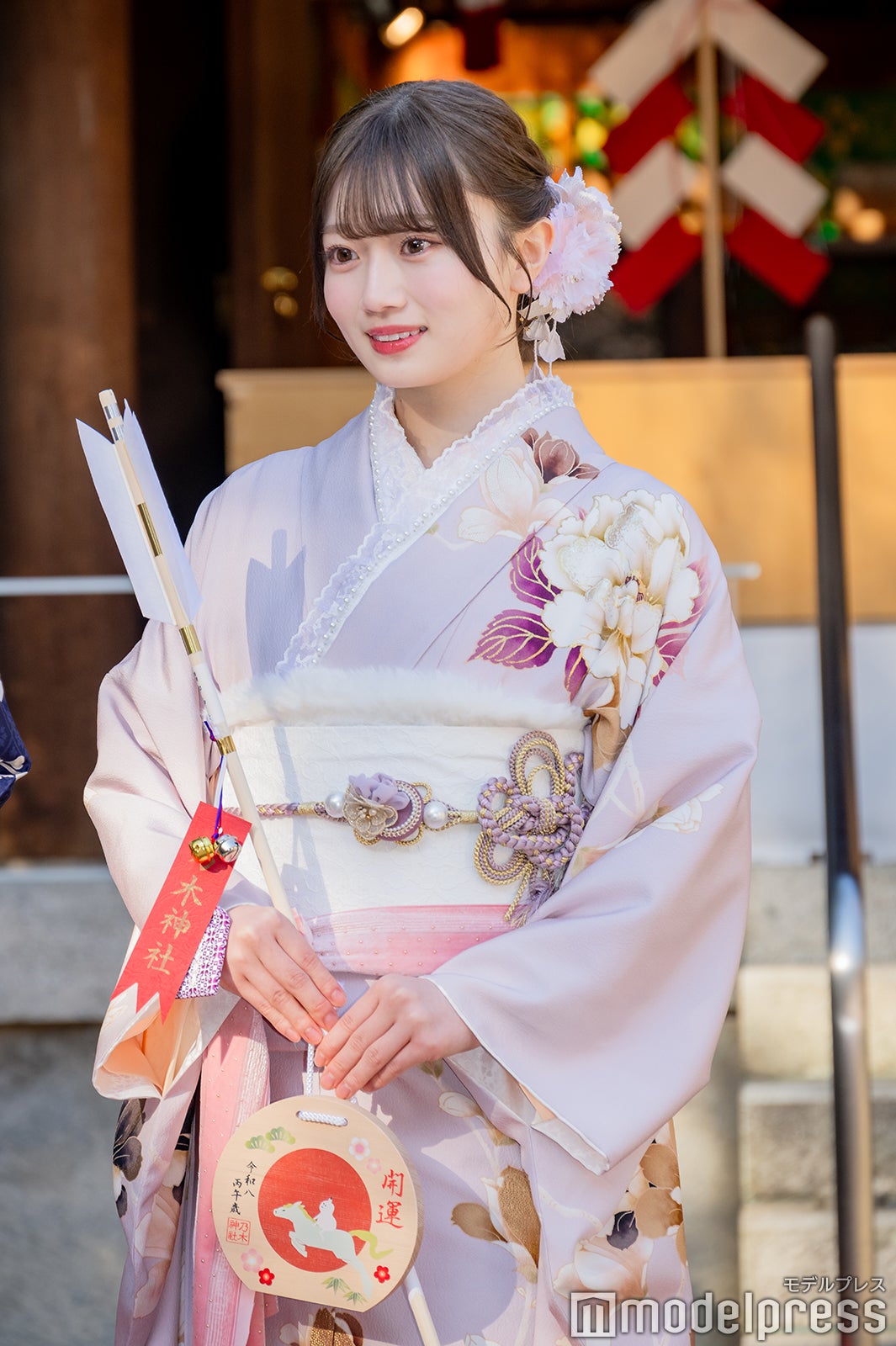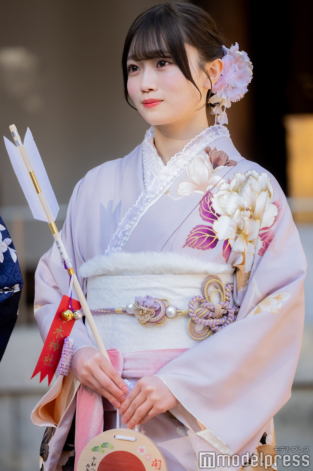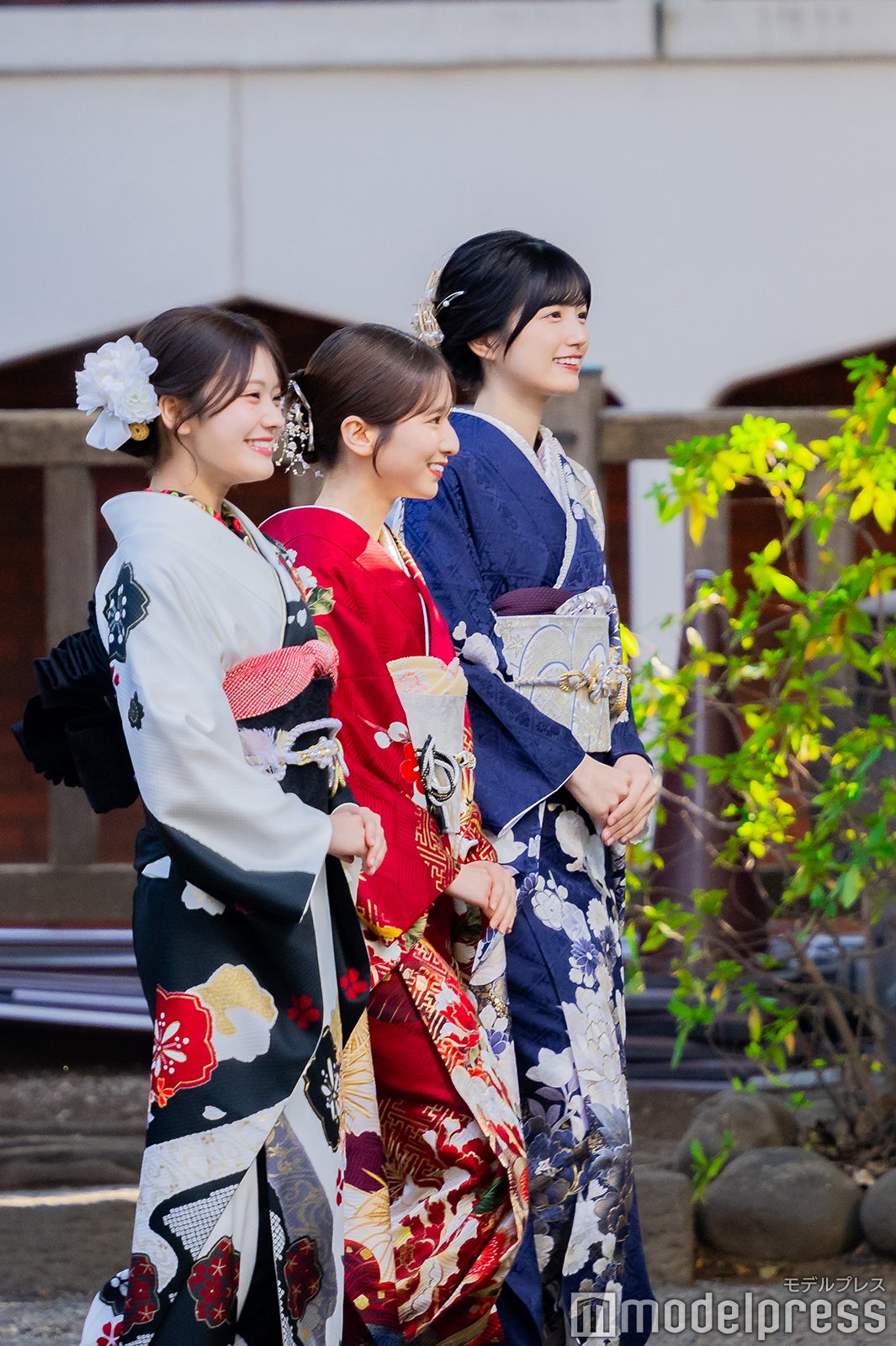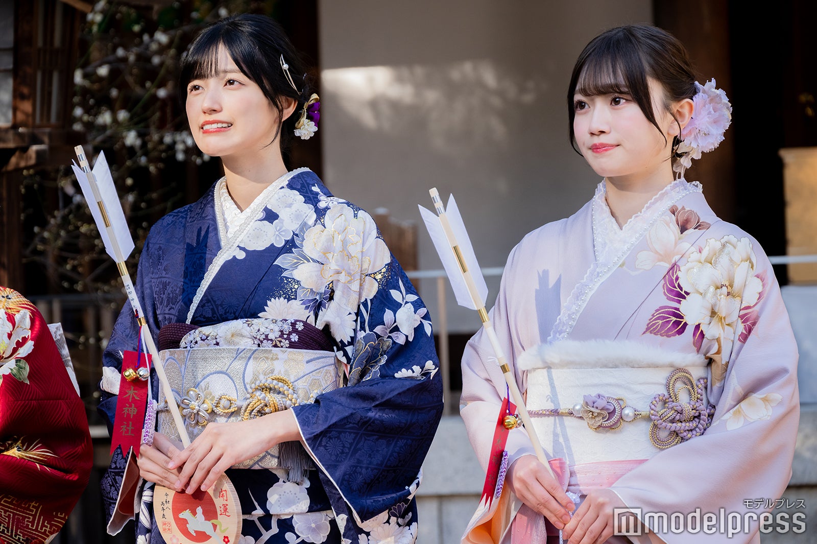 今回、成人式に参加したのは、2025年4月2日から2026年4月1日までに20歳を迎えるメンバー5人。内訳は、2022年2月にグループに加入した5期生から3人、2025年2月に加入した6期生から2人となった。5人はこの日、華やかな色柄の振袖に身を包み、晴れやかな表情で報道陣の前に登場。神主に先導されて鳥居をくぐり、厳かな空気に包まれた石畳を進んで本殿へと向かった。本殿での祈祷を終えると、再び姿を現し、それぞれの願いを込めた絵馬を手に、晴れの日にふさわしい和やかな雰囲気の中でフォトセッションに臨んだ。