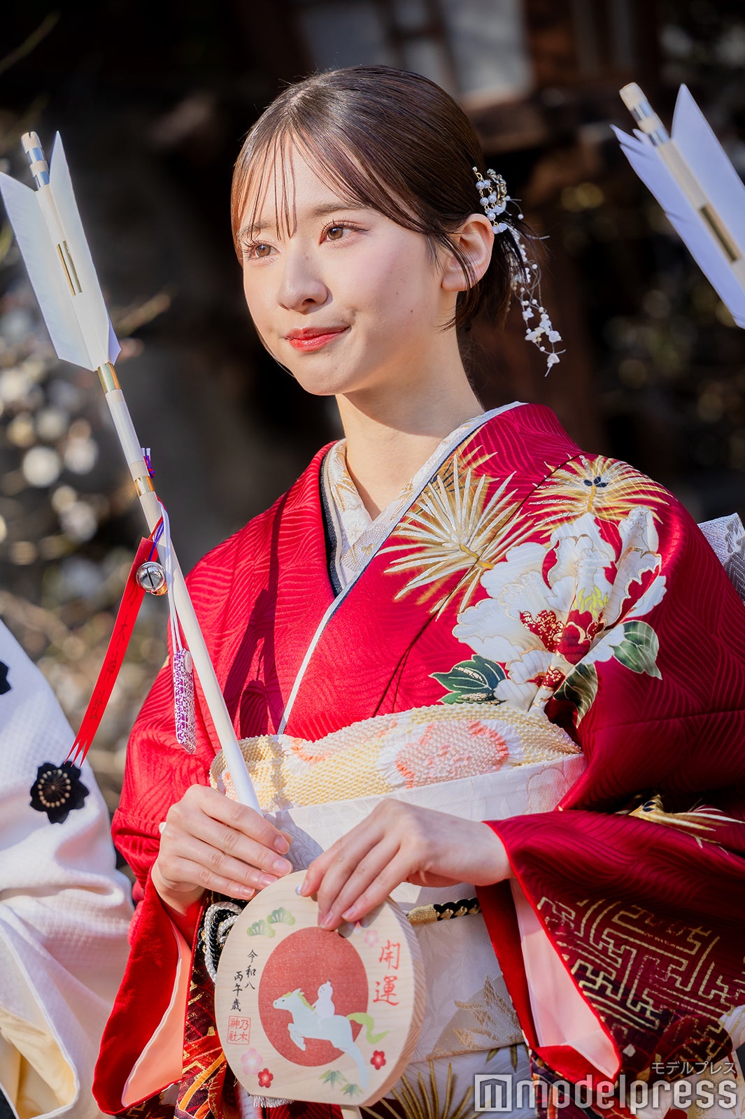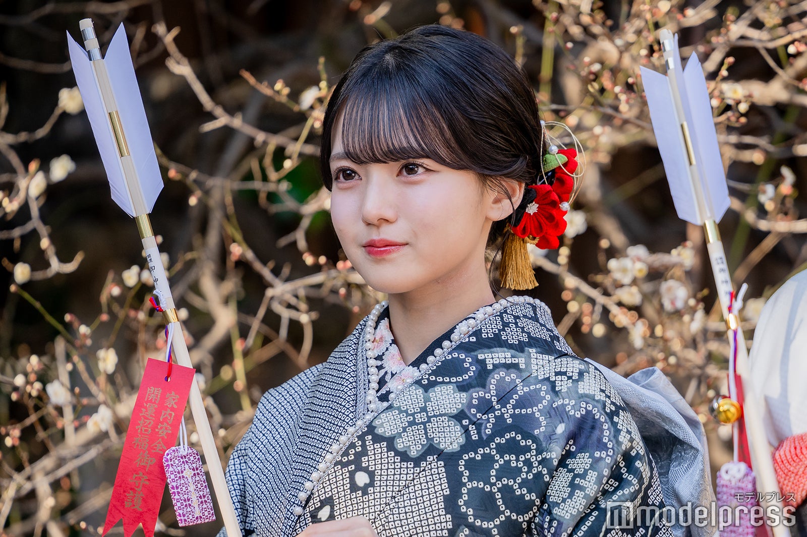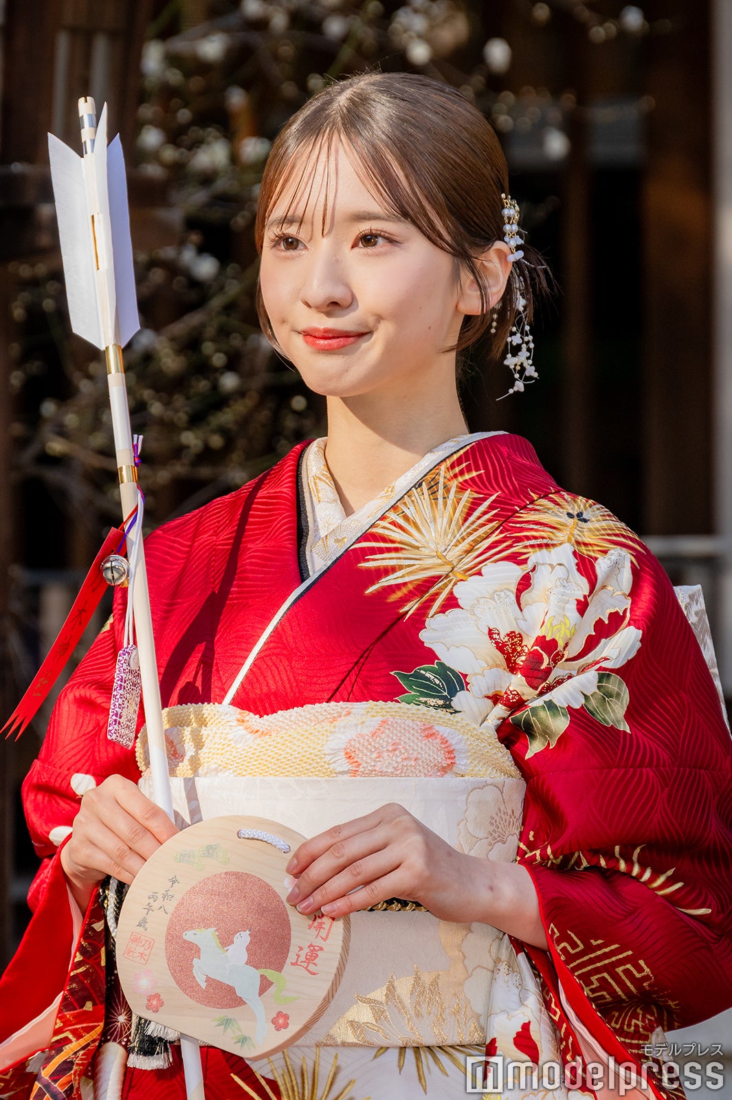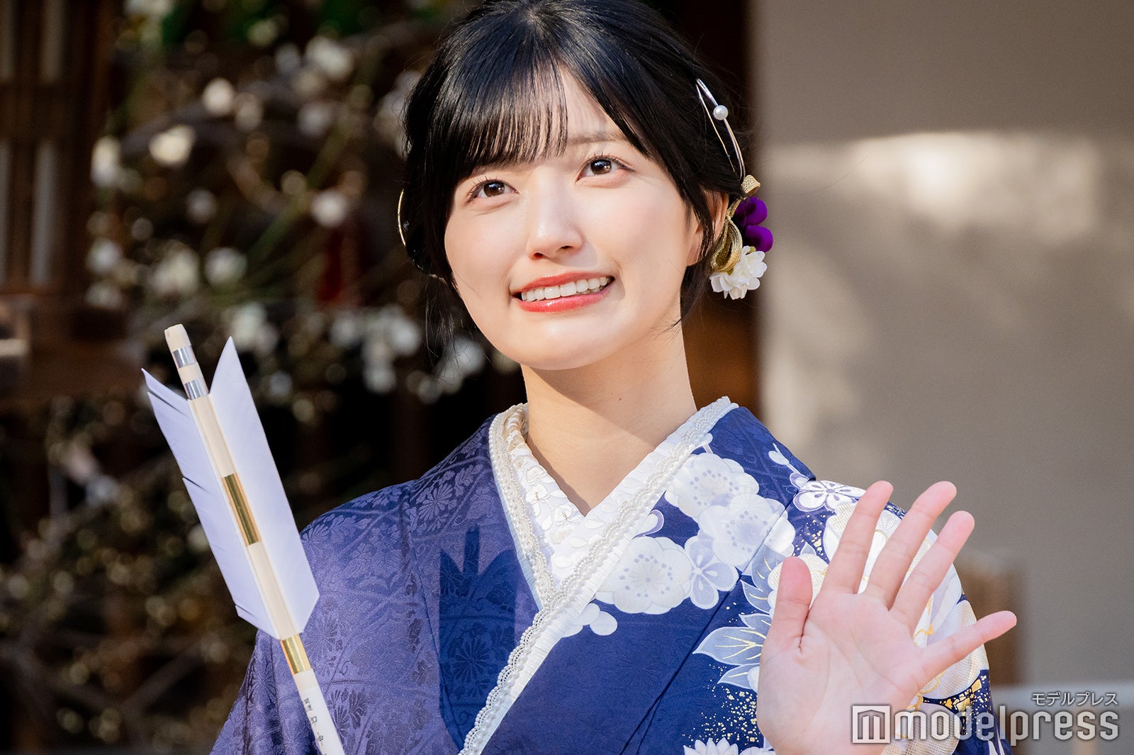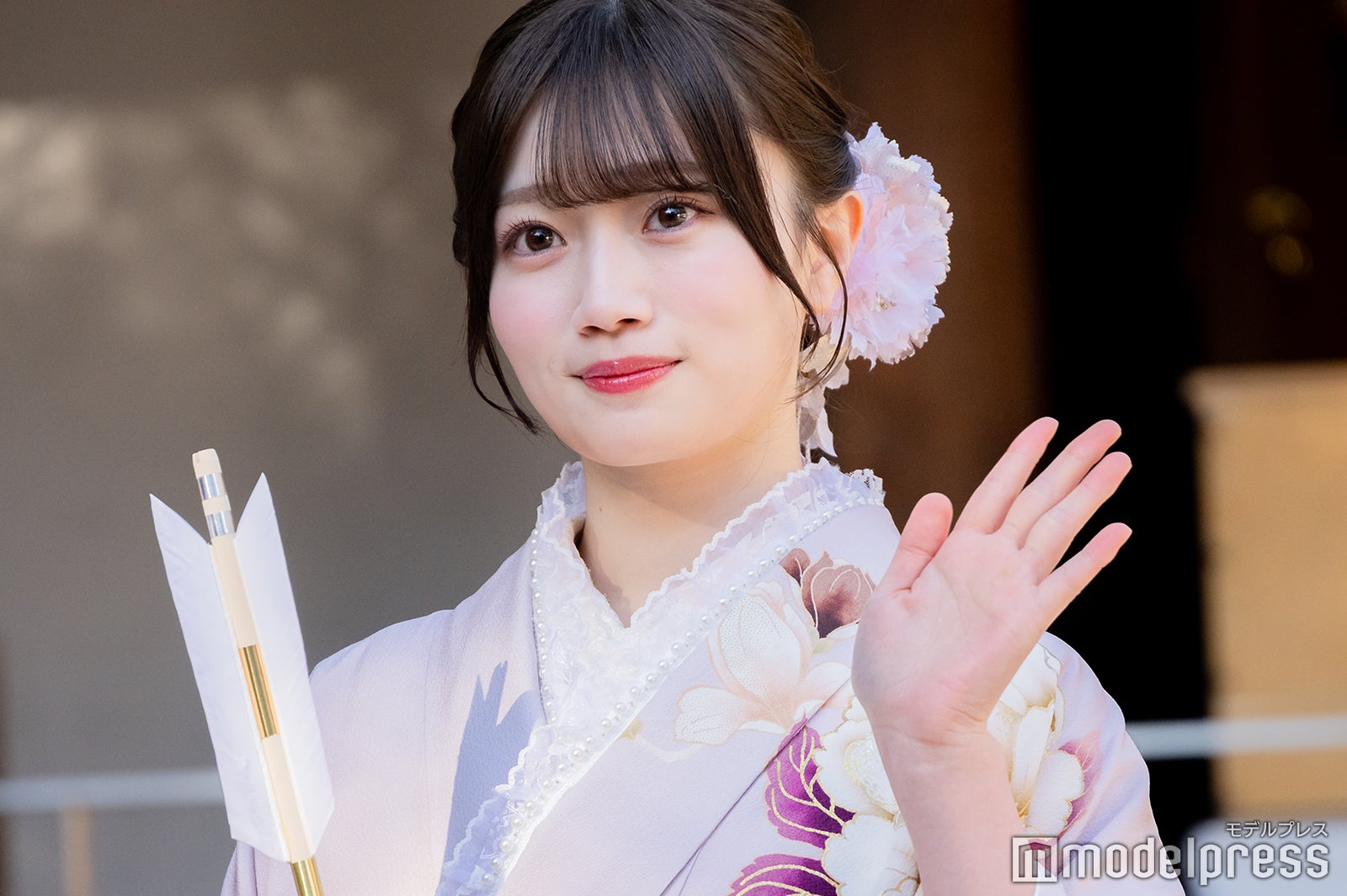 今回、成人式に参加したのは、2025年4月2日から2026年4月1日までに20歳を迎えるメンバー5人。内訳は、2022年2月にグループに加入した5期生から3人、2025年2月に加入した6期生から2人となった。5人はこの日、華やかな色柄の振袖に身を包み、晴れやかな表情で報道陣の前に登場。神主に先導されて鳥居をくぐり、厳かな空気に包まれた石畳を進んで本殿へと向かった。本殿での祈祷を終えると、再び姿を現し、それぞれの願いを込めた絵馬を手に、晴れの日にふさわしい和やかな雰囲気の中でフォトセッションに臨んだ。