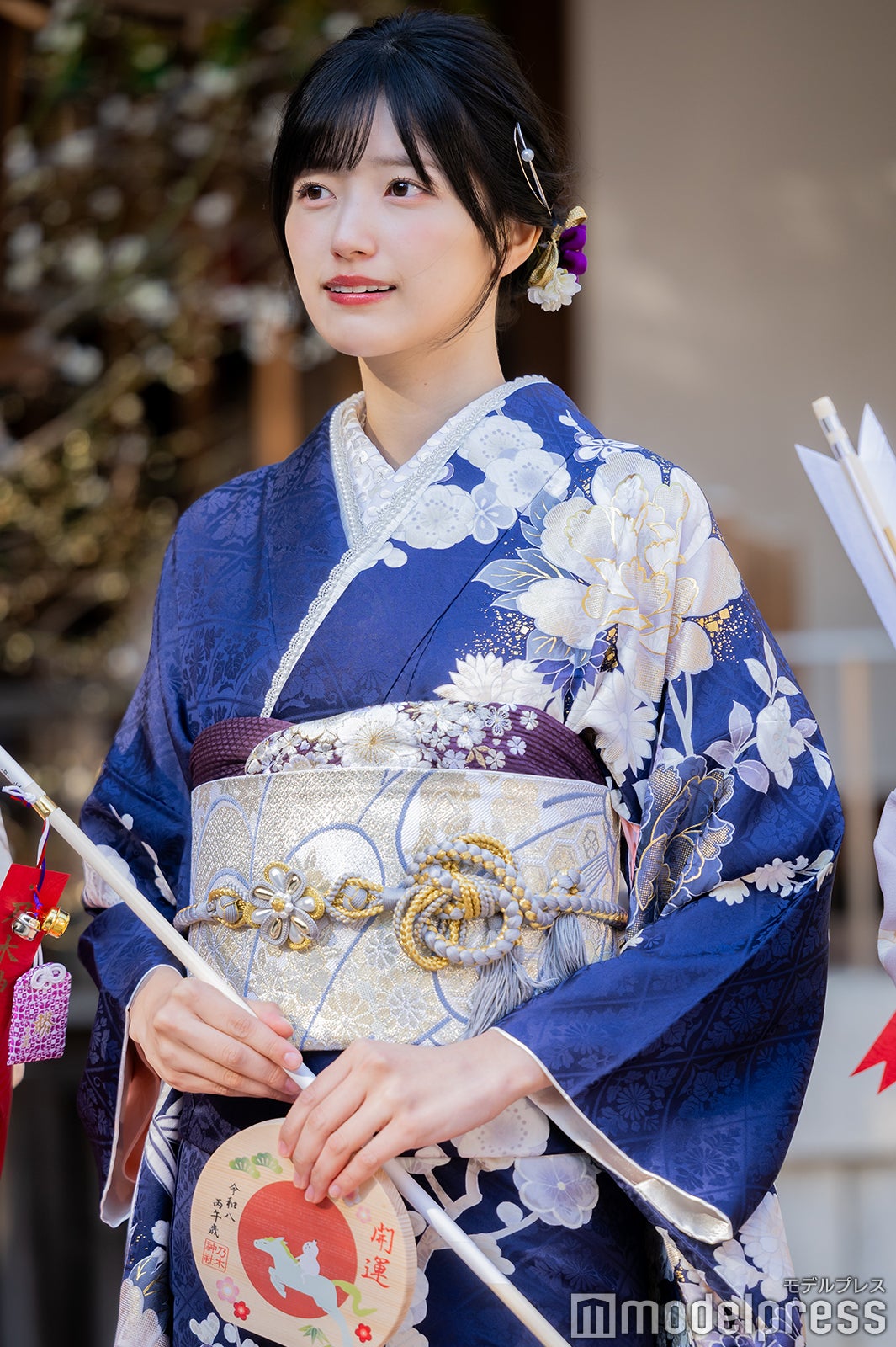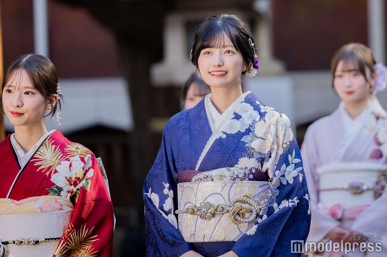 囲み取材では、それぞれが振袖のポイントを紹介。ピンクの振袖にレースの重ね衿を合わせた、やわらかくガーリーな装いを見せた愛宕は、「私はサイリウムカラーがピンク色というのと、よく顔がピンクとか赤色だねと言われることが多いので、自分のイメージカラーでピンクにさせていただきました」と説明。淡い色合いのコーディネートに、大ぶりの髪飾りもアクセントとなり、「かわいいものが好きなので、真珠を付けていただいたりとか、かわいいリボンを付けていただきました」と明かした。「寒色系の振袖で迷っていた」という五百城は、「ずっと着てみたかった」という紺色を基調にした振袖をチョイス。白や淡色の花柄が映える、上品で王道感のある一着で、編み込んだ髪には振袖にぴったりなパープルの花も添えられていた。「先輩方の着物も見て『こういうのがいいな』と考えて。こんな素敵なお着物を選ばせていただきました」と笑顔を見せた。