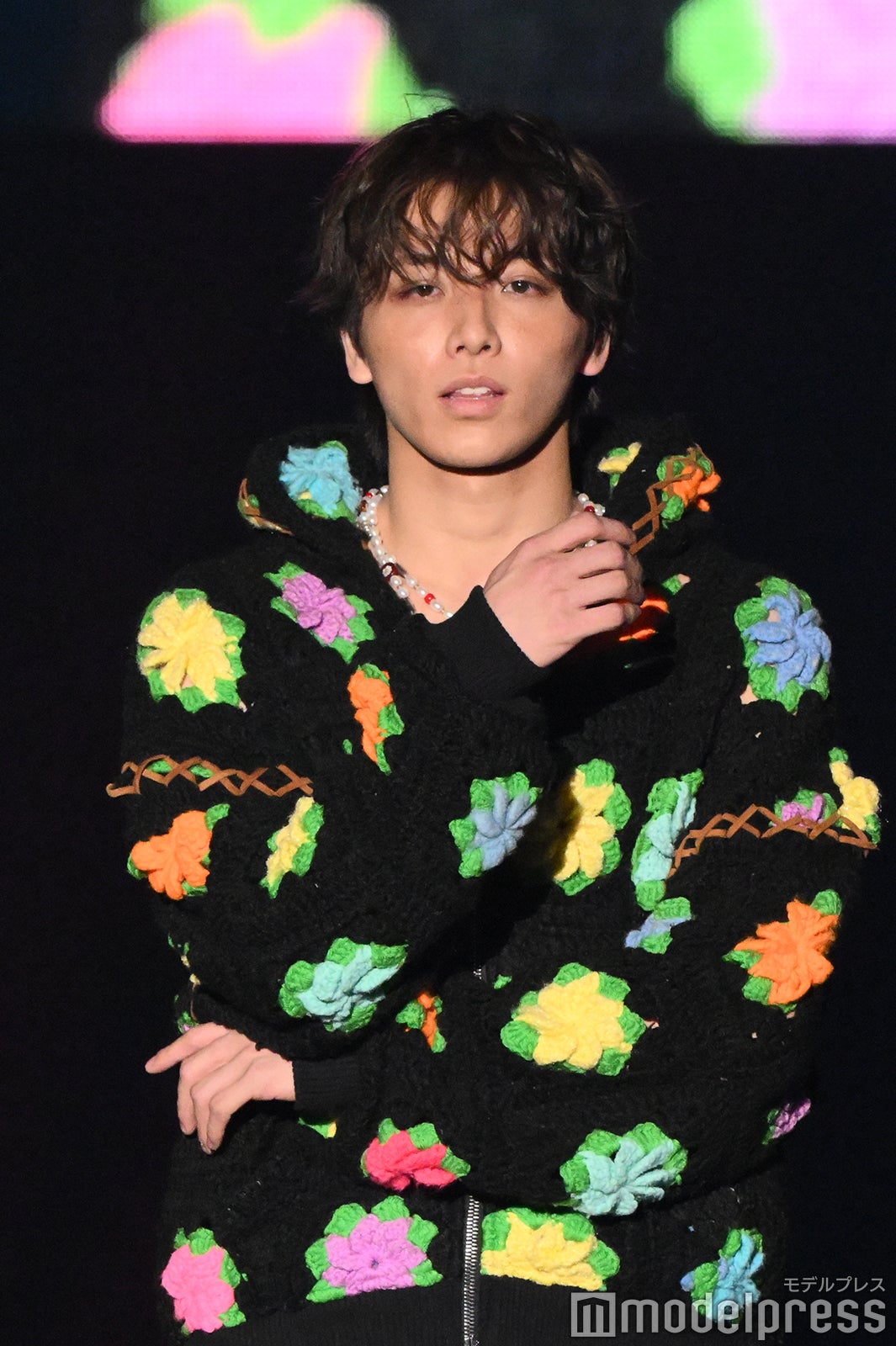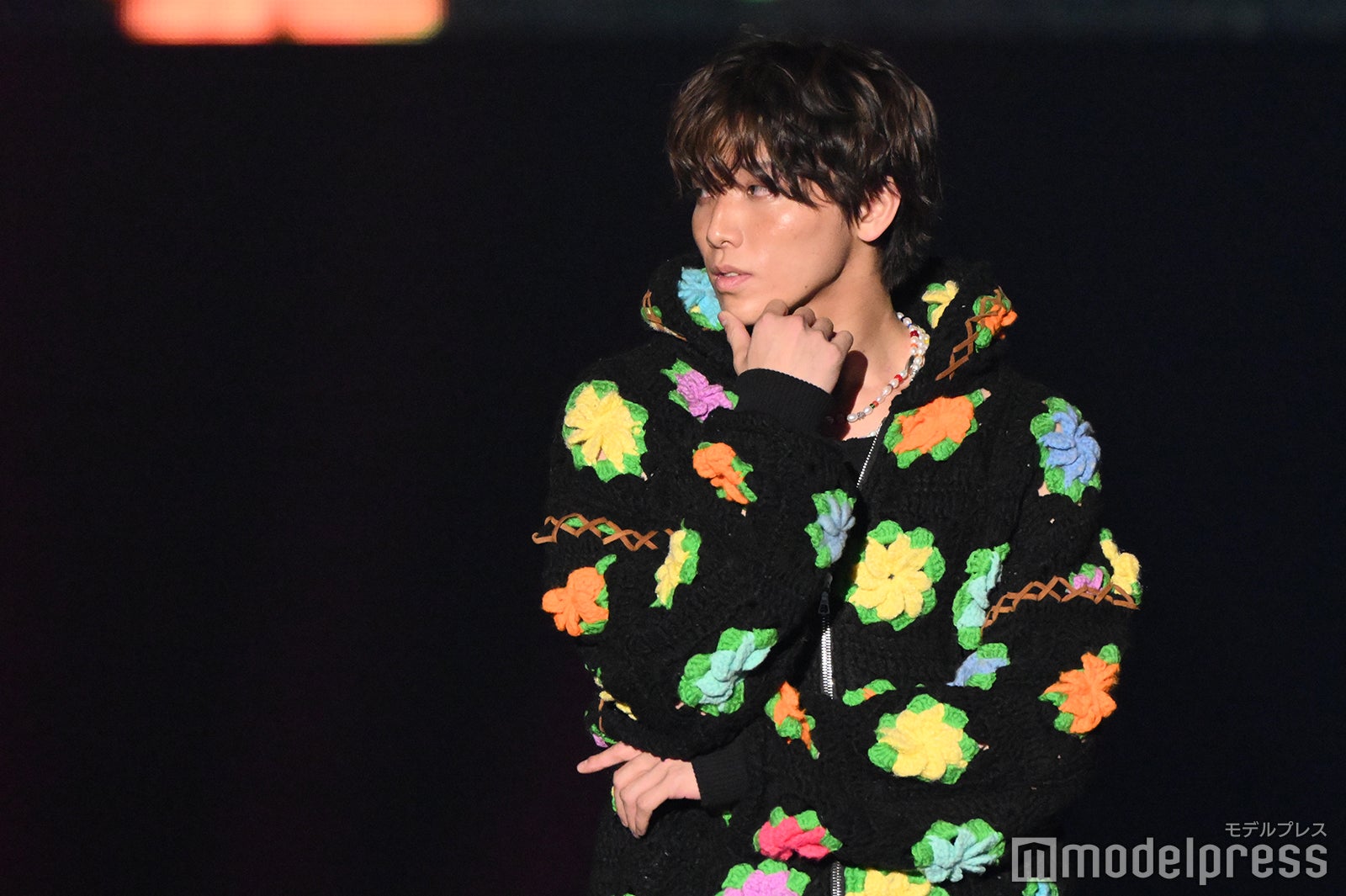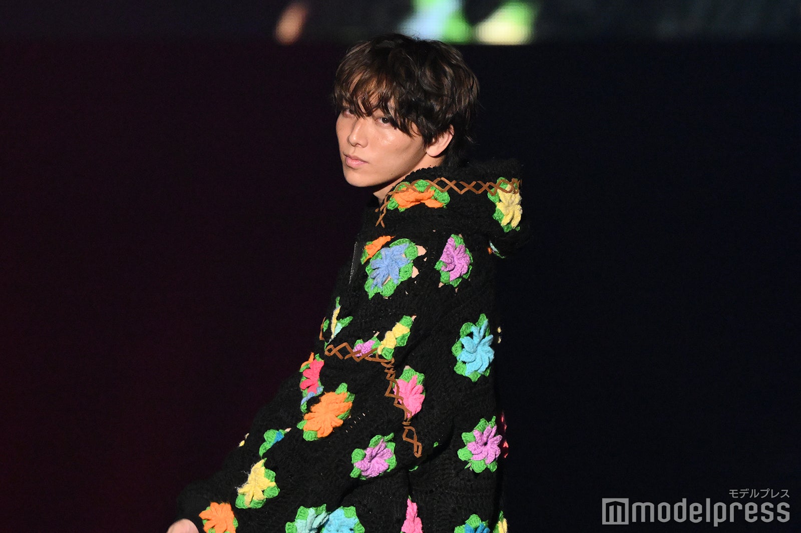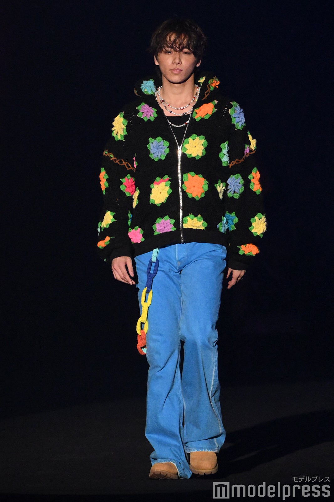 静岡出身の高尾は、カラフルな花柄があしらわれた黒地のボアコートに、鮮やかなブルーのパンツを合わせた、ひときわ目を引くポップなコーディネートで登場。首元にはビーズのアクセサリー、パンツには大ぶりのチェーンをあしらい、個性溢れるスタイリングを完成させた。ランウェイトップでは、顎に手を添えたクールなポーズを披露し、会場からは大きな歓声が上がった。「TGCしずおか」テーマは「Shining New Chapter」
