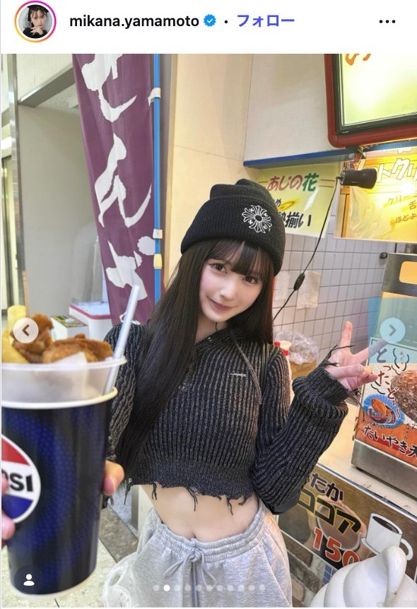 山本は「最近の写真です 何枚目が好き?」とファンに問いかけ、様々な場所で撮影した私服ショットを複数枚公開。ストリートフードを手にした写真では、ミニ丈のニットトップスとスウェットパンツというコーディネートで、色白のスリムなウエストがのぞいている。その他にも電車に乗っているショットや、居酒屋、カフェでの姿なども投稿している。山本望叶の投稿に反響