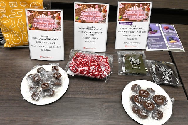 京都でチョコレート作りを始めて75年以上の「フランス屋製菓」からは、新定番の京みやげを提案する「三三屋」のデザインをプリントしたオリジナルショコラを、京都のがま口専門店「AYANOKOJI」のがま口ポーチにインした京都愛溢れるトリプルコラボ商品が登場。