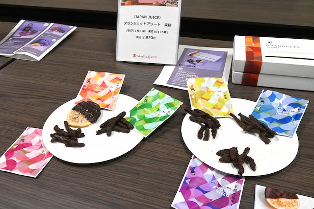 オランジェットアソート 果縁「JAPAN JUICE」(2,970円) 砂糖とたっぷりの果実で密漬けにした近畿地方産の6種の柑橘を、ダークチョコレートで包んだオランジェットは、甘さや酸っぱさ、ほろ苦さなど柑橘の種類によって異なるので、食べ比べを楽しめます。
