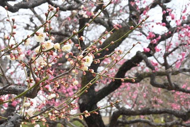 白とピンクの競演も見どころ 梅は桜と違って、早咲き→中咲き→遅咲きと順番に咲いていくため、タイミングを変えて楽しめるのが特徴。満開の梅林を楽しむなら2月中旬ごろが目安ですが、今の時期は“咲き始めを探す楽しさ”も味わえます。