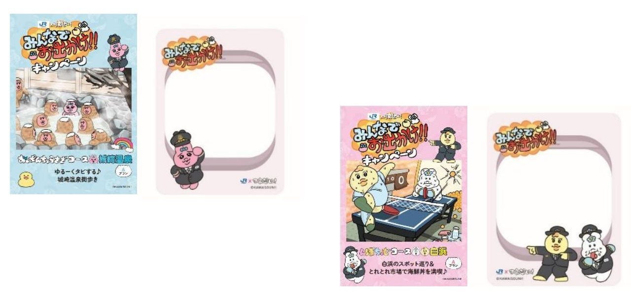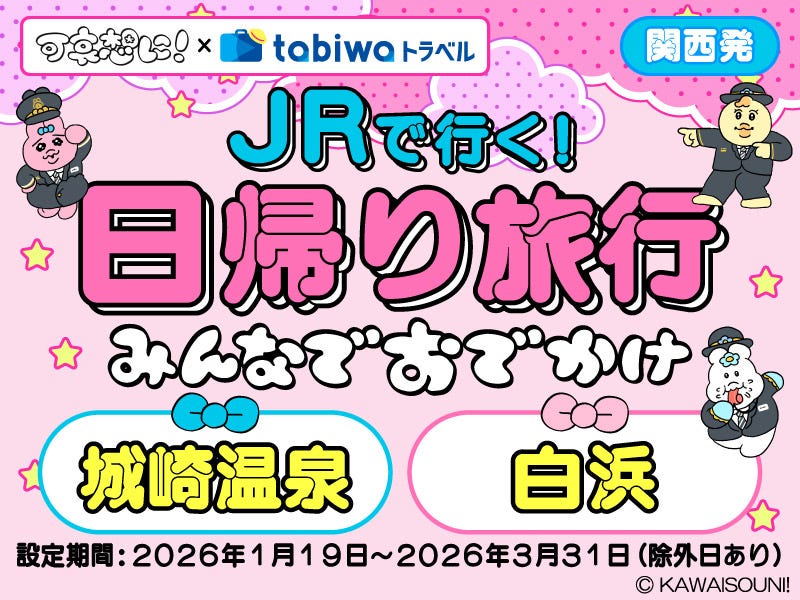 (c)KAWAISOUNI! コラボ限定の日帰り旅行プランの販売がスタート。目的地は兵庫・城崎温泉と、和歌山・白浜の2か所あり、城崎温泉には「おぱんちゅうさぎ」とおでかけ気分が味わえる「おぱんちゅうさぎコース」の2プランが、白浜には「んぽちゃむ」、「きみまろ」をフィーチャーした「んぽちゃむコース」の2プランがスタンバイします。