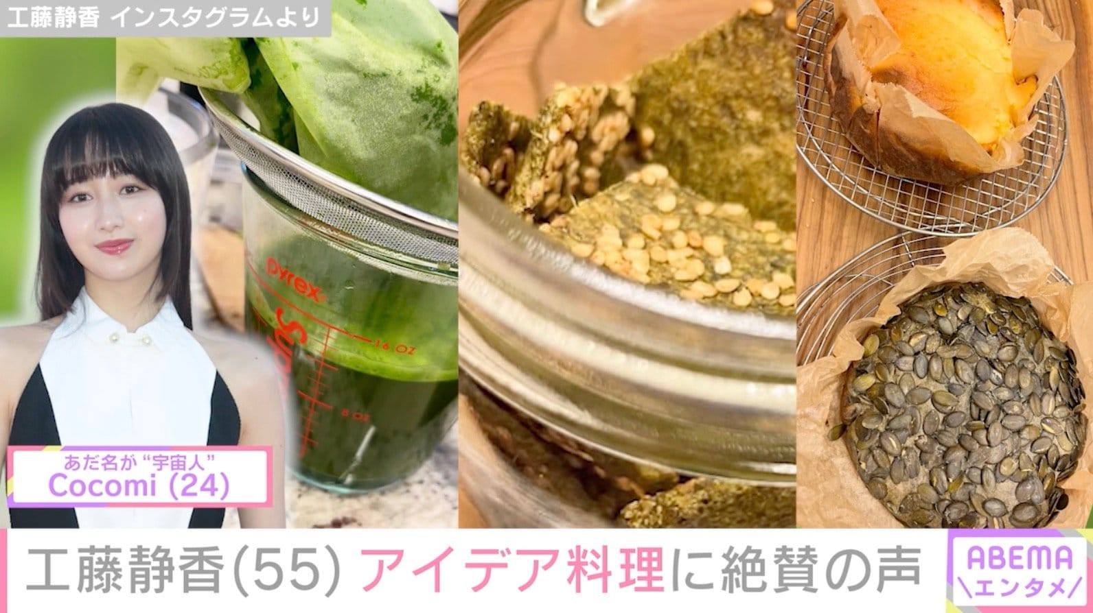 8日の投稿では、「チーズケーキとめちゃくちゃヘルシーなごまチーズケーキを焼きました!そして、野菜を進んでは食べない宇宙人に絞りたてジュースを!その残った繊維でクラッカーをつくりました。野菜のコンソメで味付けをしていますが、これが本当においしい笑」と、“宇宙人”と呼んでいる長女・Cocomi(24)のために作ったジュースやクラッカー、2種類のチーズケーキを披露。