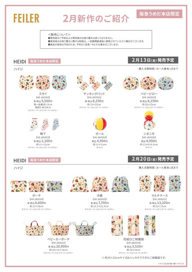 【阪急うめだ本店限定】ハイジ/ベビーアイテム オープン日の2026年2月13日(金)からは、てんとう虫にちょうちょ、小鳥たち、そして小さな花など、ドイツの野にいる小さな生き物たちが追いかけっこをしている様子をイメージしたフェイラーの人気デザイン「ハイジ」のベビーアイテムがそろいます。
