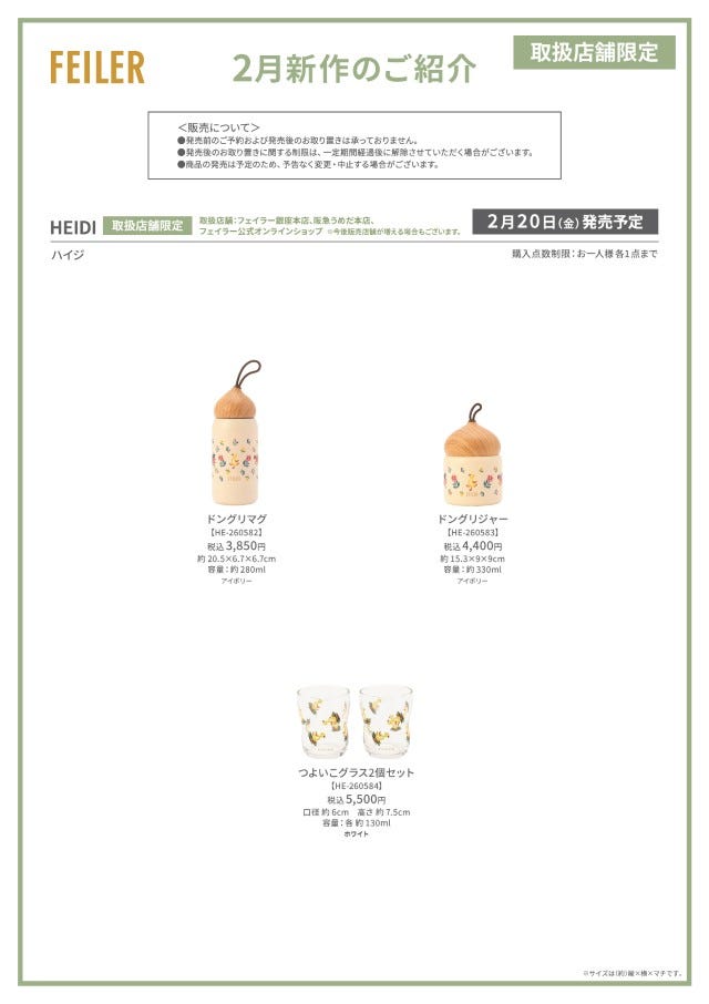 【阪急うめだ本店限定】ハイジ さらに2026年2月20日(金)からは、「阪急うめだ本店」限定商品のほか、現在はフェイラー銀座本店、阪急うめだ本店フェイラーショップ、フェイラー公式オンラインショップのみで販売する取扱店舗限定商品も登場。