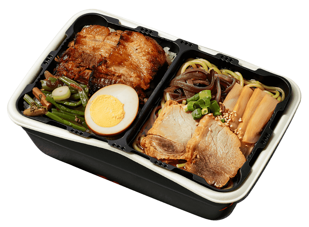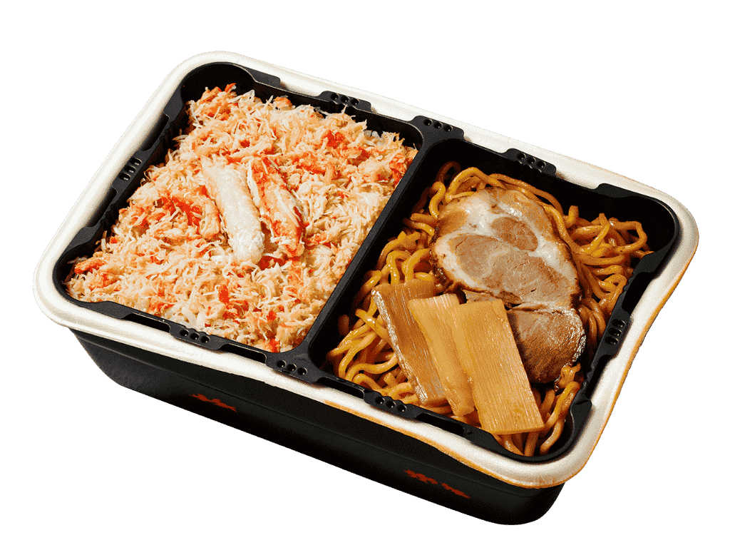 北海道 千歳線 新千歳空港駅「札幌バルナバフーズ」の「美食千歳かにめし&吉山商店 油そば」(1,880円) 今回、本イベント初企画が3つも登場するのでこちらも要注目! 1つ目が、人気の駅弁とその土地のご当地麺によるコラボ弁当。一度で二度おいしい、欲ばりさん必見の企画です。