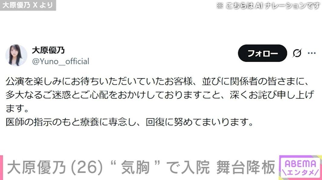 大原さんはこの日に更新したXで、「公演を楽しみにお待ちいただいていたお客様、並びに関係者の皆さまに、多大なるご迷惑とご心配をおかけしておりますこと、深くお詫び申し上げます。 医師の指示のもと療養に専念し、回復に努めてまいります。」と、コメントしています。