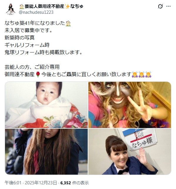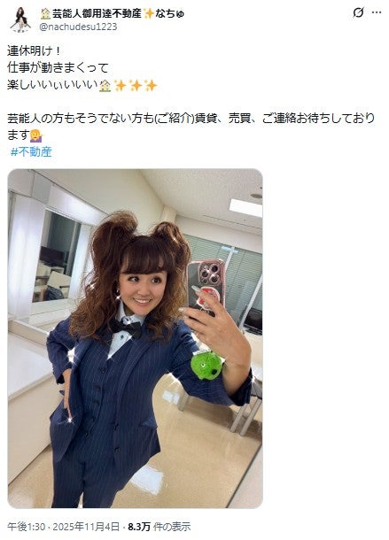 この日のスタジオトークでなちゅは「元々SDN48っていうアイドルグループに入ってたり、ギャル書道家とか、芸人とか好き勝手に自分でやりたいことをやっていたんですけど」と自身のこれまでの芸能活動を振り返った後「今は不動産になりまして」と現在は不動産業に就いていることを告白。「今日も内見からスタジオに入った」と明かしていた。なちゅ、不動産業に転職した理由明かす