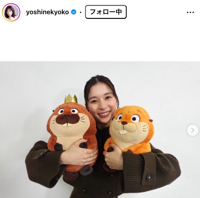 芳根はビーバーやロケット、じゃがいもなどの絵文字と、映画『私がビーバーになる時』のハッシュタグを添えて複数枚の写真を投稿。同映画のキャラクターたちのぬいぐるみを手にしており、ブラウンのワンピースと黒いタイツのコーディネートで、抜群のスタイルを見せている。芳根京子の投稿に反響