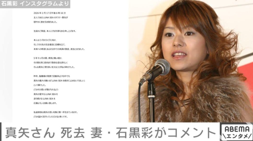 真矢さんの妻で元モーニング娘。の石黒彩さんは23日、インスタグラムを更新しコメントを発表。「本人は3月のライブに向け、 そしてその先の完全復活に目標を立て、 未来への希望にあふれる中での体調の急変、逝去となりました。昨年、脳腫瘍の発表で活動休止する中でも真矢の最大の願いは『LUNA SEAを絶対に止めないでほしい』 という事でした。どうかその想いが繋げられるよう 真矢の愛するLUNA SEAを、走り続けるLUNA SEAを、応援よろしくお願い致します。」と、呼びかけています。