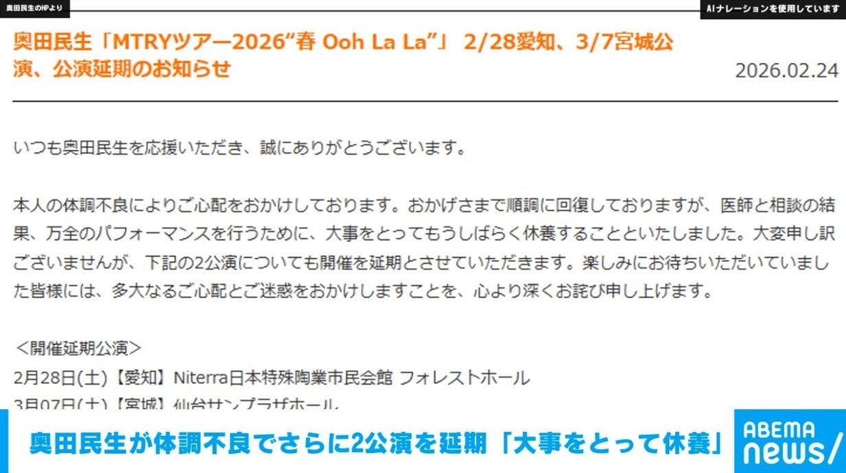 本人の体調不良によりご心配をおかけしております。おかげさまで順調に回復しておりますが、医師と相談の結果、万全のパフォーマンスを行うために、大事をとってもうしばらく休養することといたしました。大変申し訳ございませんが、下記の2公演についても開催を延期とさせていただきます。楽しみにお待ちいただいていました皆様には、多大なるご心配とご迷惑をおかけしますことを、心より深くお詫び申し上げます。