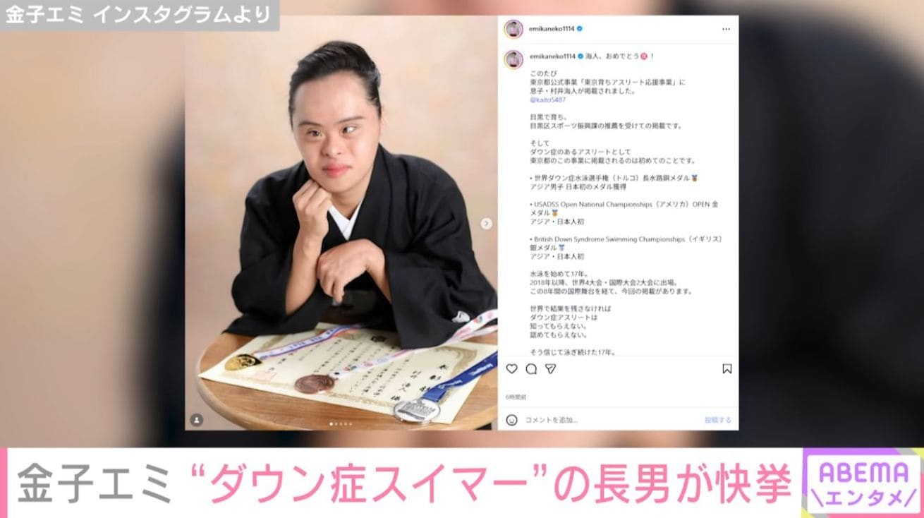 俳優・金子貴俊(48)の姉で、パーツモデルや美容研究家として活動する金子エミ(55)が、27日、Instagramを更新。長男でダウン症スイマーの村井海人さん(28)が、新たな快挙を成し遂げたことを明かした。